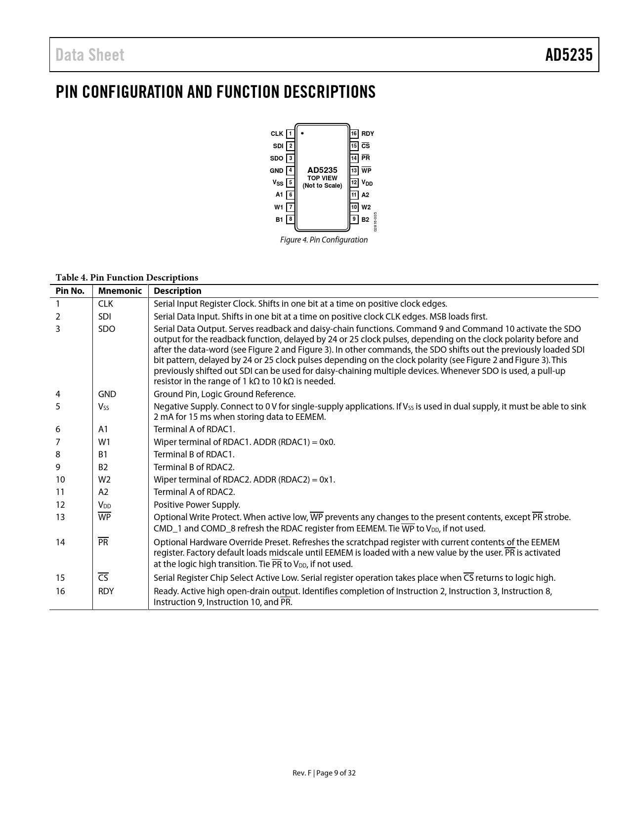 link to page 7 link to page 7 link to page 7 link to page 7 Data SheetAD5235PIN CONFIGURATION AND FUNCTION DESCRIPTIONSCLK 116RDYSDI215 CSSDO314PRGND 4AD523513 WPTOP VIEWVSS 512 VDD(Not to Scale)A1611A2W1710 W2B1 005 89B2 02816- Figure 4. Pin Configuration Table 4. Pin Function Descriptions Pin No.Mnemonic Description 1 CLK Serial Input Register Clock. Shifts in one bit at a time on positive clock edges. 2 SDI Serial Data Input. Shifts in one bit at a time on positive clock CLK edges. MSB loads first. 3 SDO Serial Data Output. Serves readback and daisy-chain functions. Command 9 and Command 10 activate the SDO output for the readback function, delayed by 24 or 25 clock pulses, depending on the clock polarity before and after the data-word (see Figure 2 and Figure 3). In other commands, the SDO shifts out the previously loaded SDI bit pattern, delayed by 24 or 25 clock pulses depending on the clock polarity (see Figure 2 and Figure 3). This previously shifted out SDI can be used for daisy-chaining multiple devices. Whenever SDO is used, a pull-up resistor in the range of 1 kΩ to 10 kΩ is needed. 4 GND Ground Pin, Logic Ground Reference. 5 VSS Negative Supply. Connect to 0 V for single-supply applications. If VSS is used in dual supply, it must be able to sink 2 mA for 15 ms when storing data to EEMEM. 6 A1 Terminal A of RDAC1. 7 W1 Wiper terminal of RDAC1. ADDR (RDAC1) = 0x0. 8 B1 Terminal B of RDAC1. 9 B2 Terminal B of RDAC2. 10 W2 Wiper terminal of RDAC2. ADDR (RDAC2) = 0x1. 11 A2 Terminal A of RDAC2. 12 VDD Positive Power Supply. 13 WP Optional Write Protect. When active low, WP prevents any changes to the present contents, except PR strobe. CMD_1 and COMD_8 refresh the RDAC register from EEMEM. Tie WP to VDD, if not used. 14 PR Optional Hardware Override Preset. Refreshes the scratchpad register with current contents of the EEMEM register. Factory default loads midscale until EEMEM is loaded with a new value by the user. PR is activated at the logic high transition. Tie PR to VDD, if not used. 15 CS Serial Register Chip Select Active Low. Serial register operation takes place when CS returns to logic high. 16 RDY Ready. Active high open-drain output. Identifies completion of Instruction 2, Instruction 3, Instruction 8, Instruction 9, Instruction 10, and PR. Rev. F | Page 9 of 32 Document Outline Features Applications General Description Functional Block Diagram Revision History Specifications Electrical Characteristics—25 kΩ, 250 kΩ Versions Interface Timing and EEMEM Reliability Characteristics—25 kΩ, 250 kΩ Versions Timing Diagrams Absolute Maximum Ratings ESD Caution Pin Configuration and Function Descriptions Typical Performance Characteristics Test Circuits Theory of Operation Scratchpad and EEMEM Programming Basic Operation EEMEM Protection Digital Input and Output Configuration Serial Data Interface Daisy-Chain Operation Terminal Voltage Operating Range Power-Up Sequence Layout and Power Supply Bypassing Advanced Control Modes Linear Increment and Decrement Instructions Logarithmic Taper Mode Adjustment Using to Re-Execute a Previous Command Using Additional Internal Nonvolatile EEMEM Calculating Actual End-to-End Terminal Resistance RDAC Structure Programming the Variable Resistor Rheostat Operation Programming the Potentiometer Divider Voltage Output Operation Programming Examples EVAL-AD5235SDZ Evaluation Kit Applications Information Bipolar Operation from Dual Supplies Gain Control Compensation High Voltage Operation DAC Bipolar Programmable Gain Amplifier 10-Bit Bipolar DAC Programmable Voltage Source with Boosted Output Programmable Current Source Programmable Bidirectional Current Source Programmable Low-Pass Filter Programmable Oscillator Optical Transmitter Calibration with ADN2841 Resistance Scaling Resistance Tolerance, Drift, and Temperature Coefficient Mismatch Considerations RDAC Circuit Simulation Model Outline Dimensions Ordering Guide