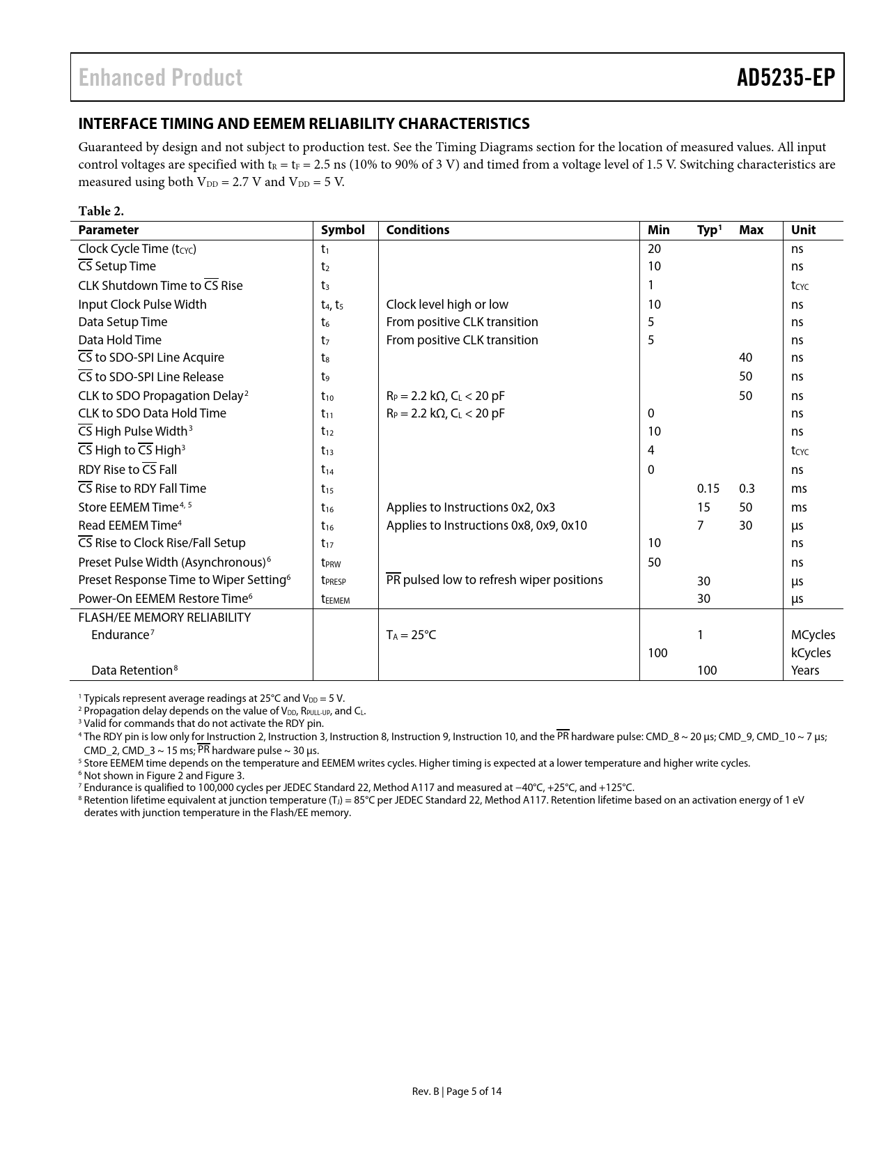 Enhanced Product. AD5235-EP. INTERFACE TIMING AND EEMEM RELIABILITY CHARACTERISTICS. Table 2. Parameter. Symbol. Conditions. Min