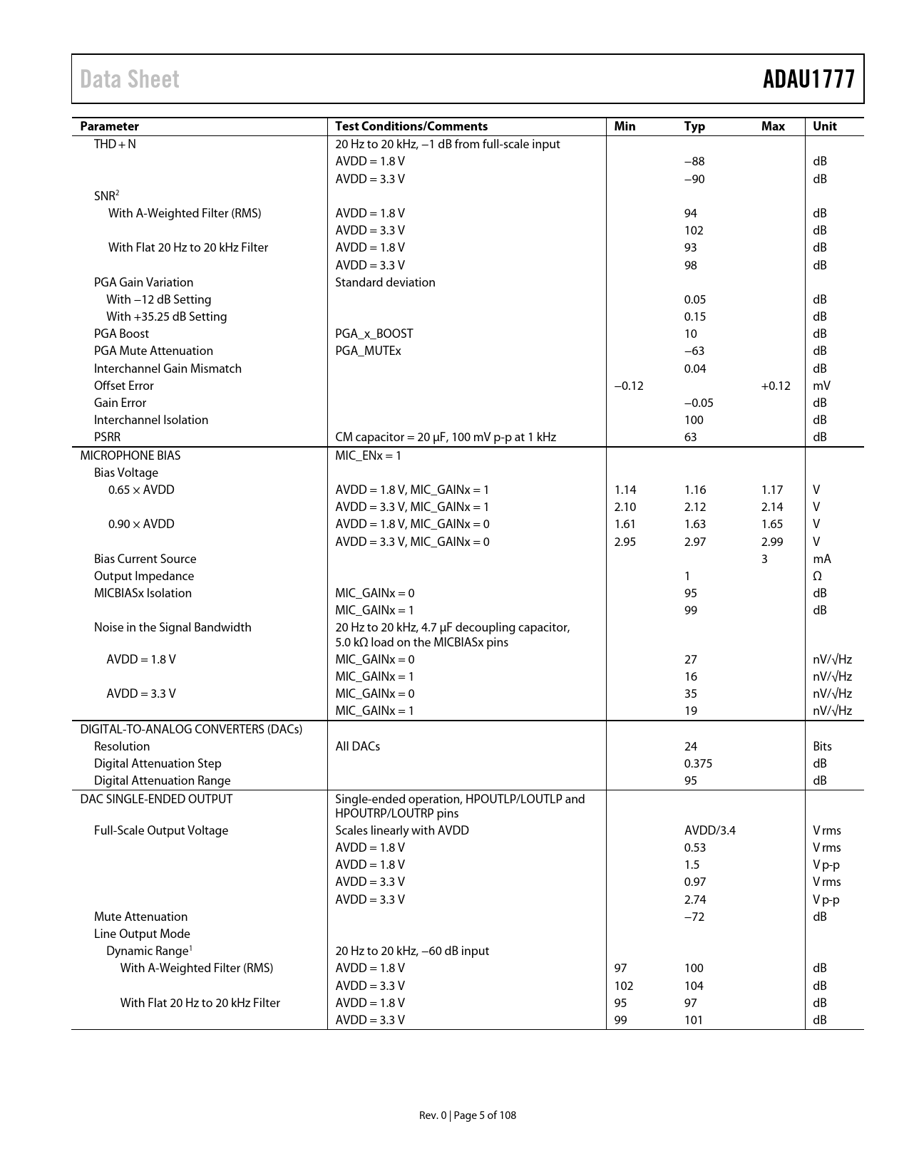 页数 / 页108 / 5 — Data Sheet. ADAU1777. Parameter. Test Conditions/Comments. Min. Typ. Max. …