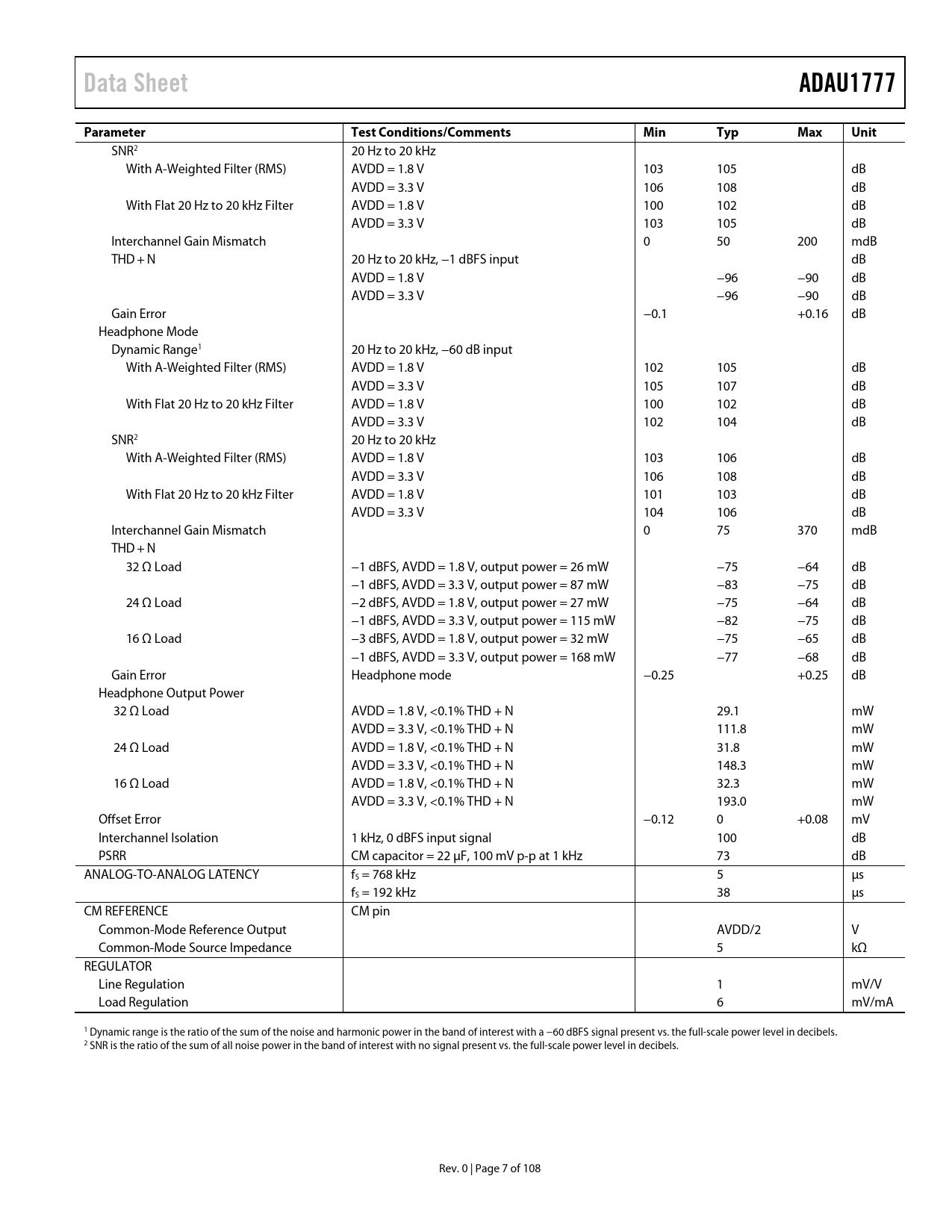 页数 / 页108 / 7 — Data Sheet. ADAU1777. Parameter. Test Conditions/Comments. Min. Typ. Max. …