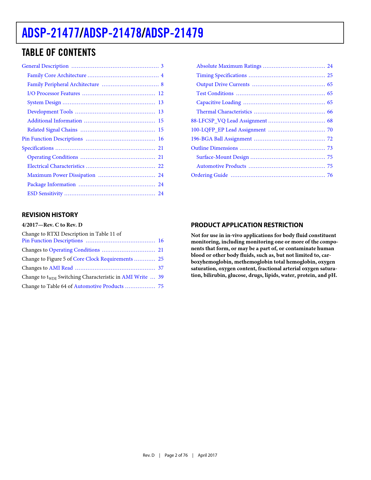 ADSP-21477/. ADSP-21478/. ADSP-21479. TABLE OF CONTENTS. REVISION HISTORY. 4/2017—Rev. C to Rev. D. PRODUCT APPLICATION RESTRICTION