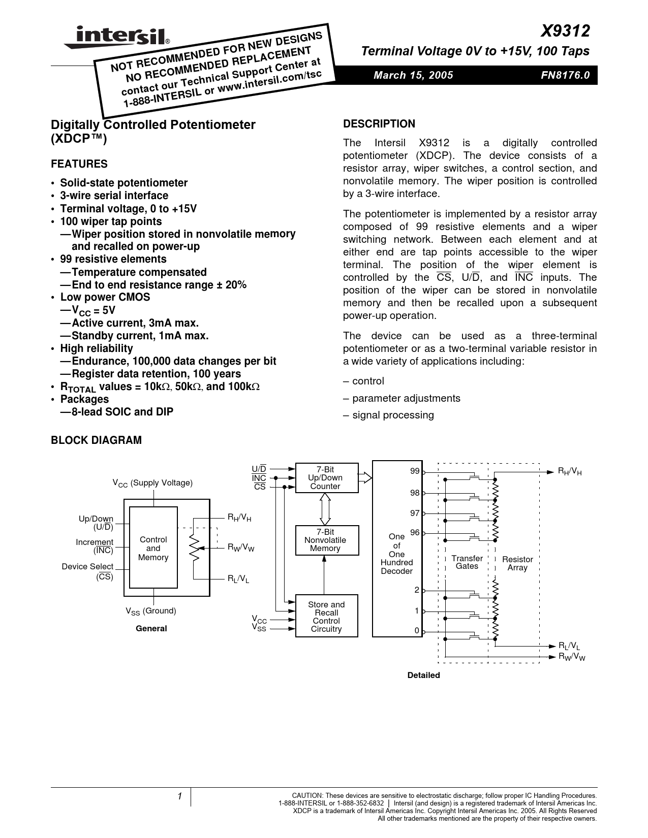 X9312. Terminal Voltage 0V to +15V, 100 Taps. NOT RECOMMENDED FOR NEW DESIGNS. Data Sheet. March 15, 2005. FN8176.0