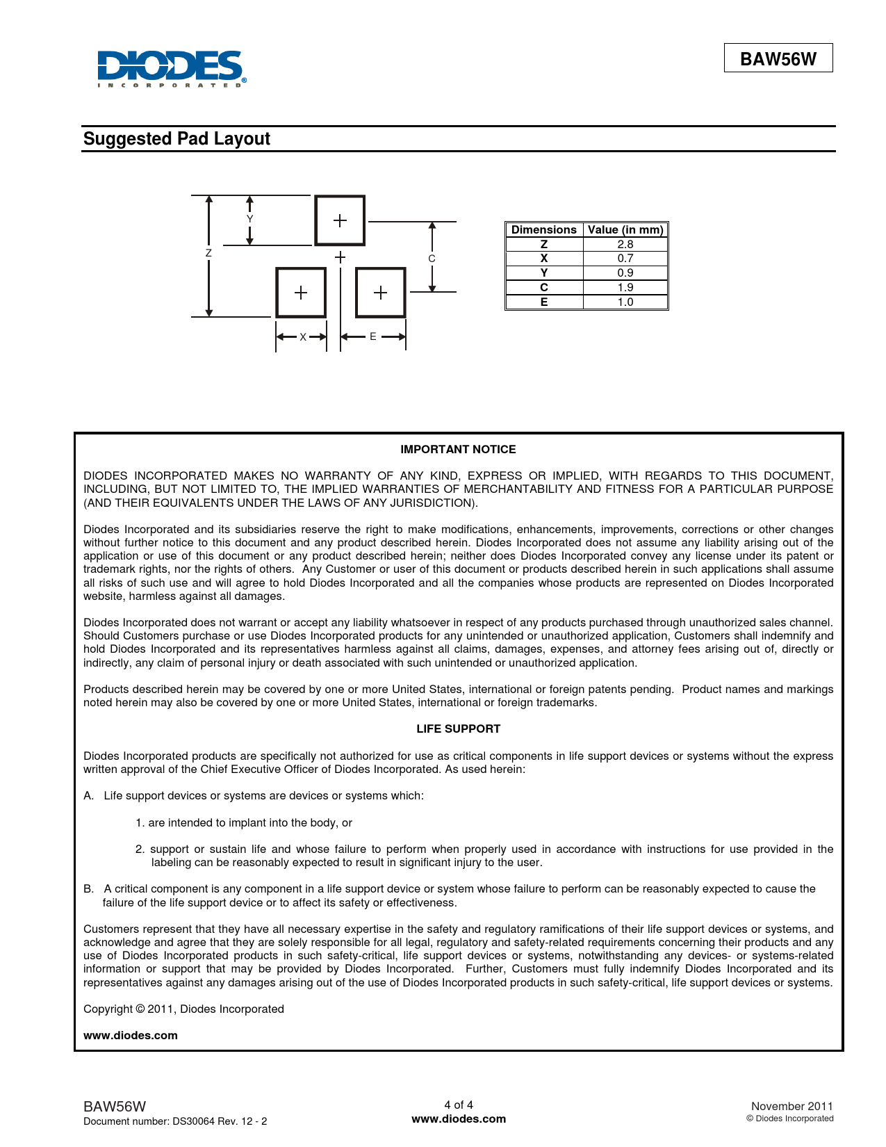 BAW56W. Suggested Pad Layout. Dimensions. Value (in mm). IMPORTANT NOTICE. LIFE SUPPORT. www.diodes.com