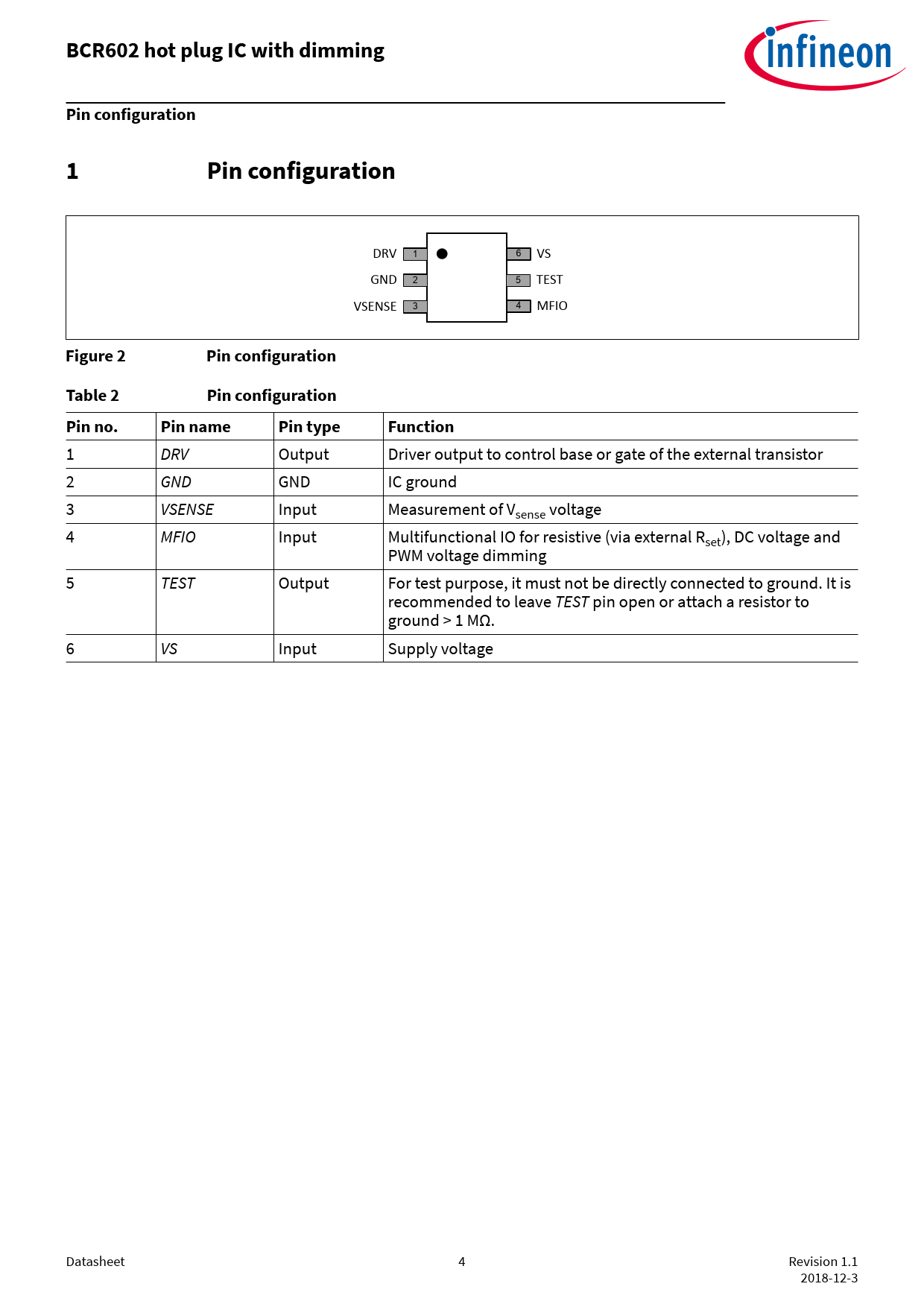 BCR602 hot plug IC with dimmingPin configuration1Pin configuration DRV 1 6 VS GND 2 5 TEST VSENSE 3 4 MFIO Figure 2Pin configurationTable 2Pin configurationPin no.Pin namePin typeFunction 1 DRV Output Driver output to control base or gate of the external transistor 2 GND GND IC ground 3 VSENSE Input Measurement of Vsense voltage 4 MFIO Input Multifunctional IO for resistive (via external Rset), DC voltage and PWM voltage dimming 5 TEST Output For test purpose, it must not be directly connected to ground. It is recommended to leave TEST pin open or attach a resistor to ground > 1 MΩ. 6 VS Input Supply voltage Datasheet 4 Revision 1.1 2018-12-3 Document Outline Features Protection features Target applications Advantages with respect to discrete solutions Product validation Device information Description Table of contents 1 Pin configuration 2 Functional description 3 Thermal characteristics 4 Absolute maximum ratings 5 Operating conditions 6 Electrical characteristics 7 Package information 8 References Revision history Disclaimer