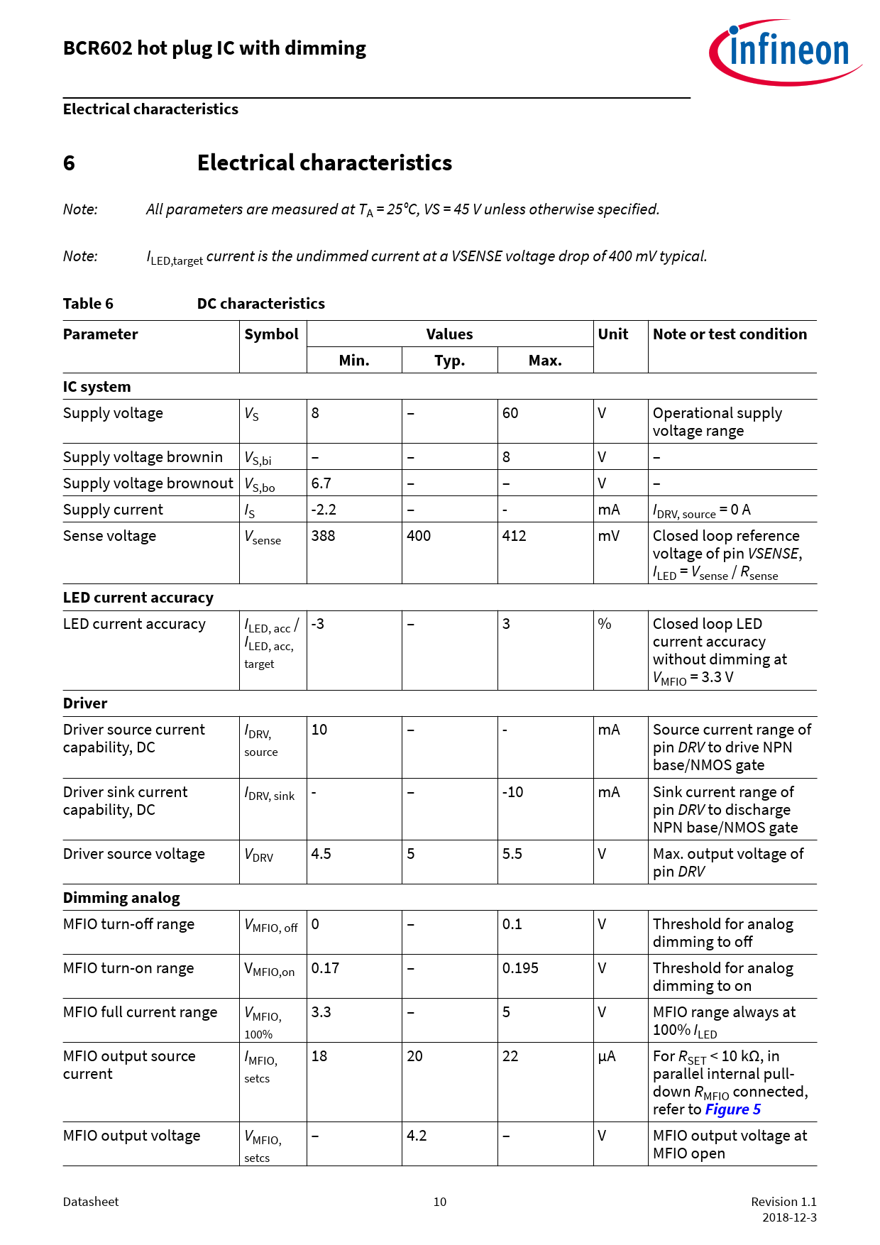 BCR602 hot plug IC with dimming Electrical characteristics Table 6 DC characteristics Parameter Symbol Values Unit