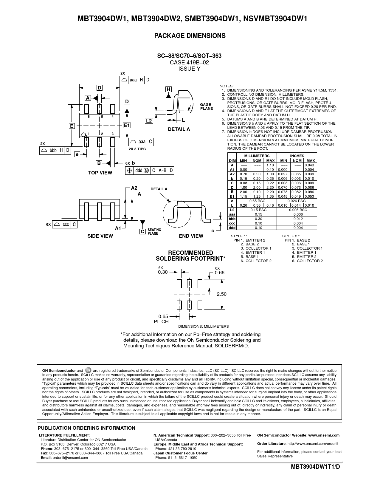 MBT3904DW1, MBT3904DW2, SMBT3904DW1, NSVMBT3904DW1. PACKAGE DIMENSIONS. SC−88/SC70−6/SOT−363. GAGE. PLANE. DETAIL A. 2X 3 TIPS