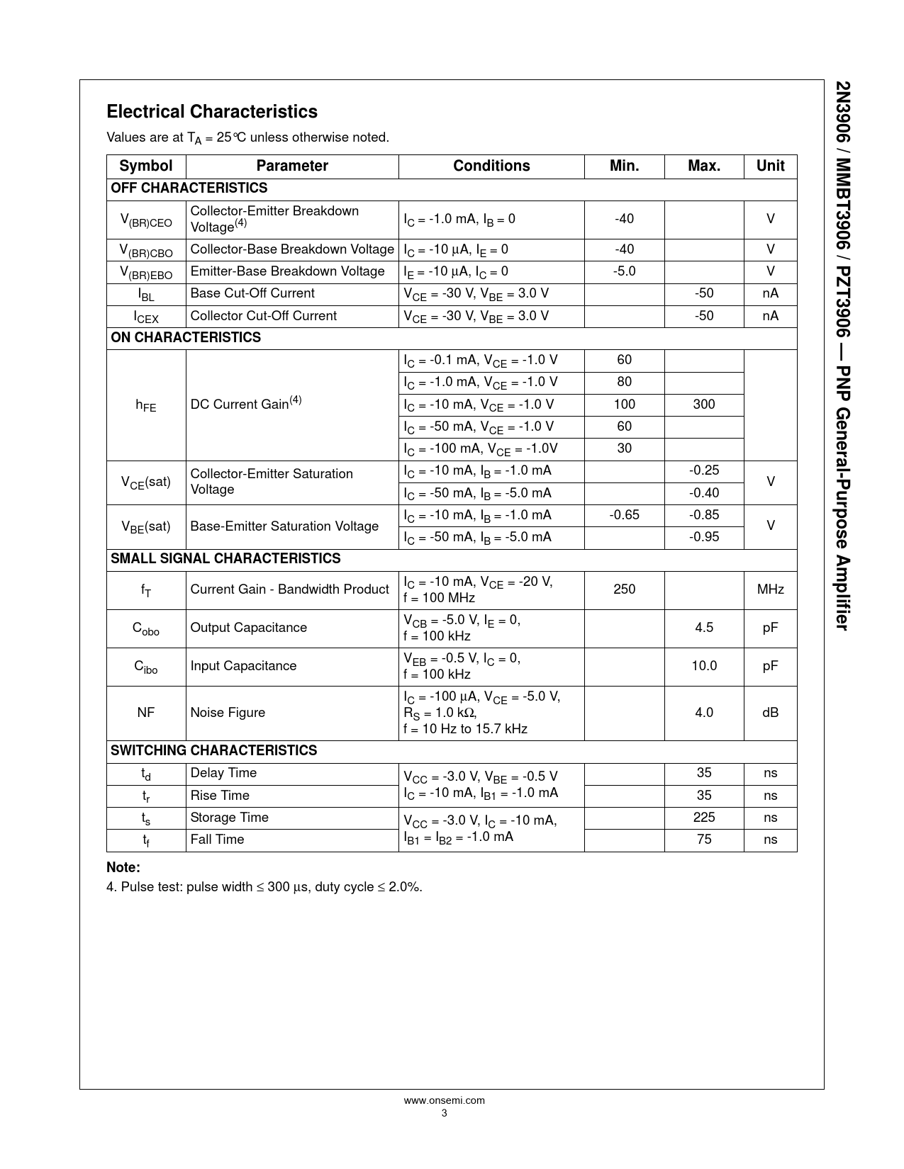 2 N 3906 / MMBT3906 / PZTElectrical Characteristics Values are at TA = 25°C unless otherwise noted. SymbolParameterConditionsMin.Max.UnitOFF CHARACTERISTICS Collector-Emitter Breakdown V(BR)CEO Voltage(4) IC = -1.0 mA, IB = 0 -40 V V(BR)CBO Collector-Base Breakdown Voltage IC = -10 μA, IE = 0 -40 V V(BR)EBO Emitter-Base Breakdown Voltage IE = -10 μA, IC = 0 -5.0 V IBL Base Cut-Off Current VCE = -30 V, VBE = 3.0 V -50 nA 3906 — ICEX Collector Cut-Off Current VCE = -30 V, VBE = 3.0 V -50 nA ON CHARACTERISTICS IC = -0.1 mA, VCE = -1.0 V 60 P N IC = -1.0 mA, VCE = -1.0 V 80 P Gen hFE DC Current Gain(4) IC = -10 mA, VCE = -1.0 V 100 300 IC = -50 mA, VCE = -1.0 V 60 era IC = -100 mA, VCE = -1.0V 30 l-Purpose Collector-Emitter Saturation IC = -10 mA, IB = -1.0 mA -0.25 VCE(sat) V Voltage IC = -50 mA, IB = -5.0 mA -0.40 IC = -10 mA, IB = -1.0 mA -0.65 -0.85 VBE(sat) Base-Emitter Saturation Voltage V IC = -50 mA, IB = -5.0 mA -0.95 AmplifierSMALL SIGNAL CHARACTERISTICS I f C = -10 mA, VCE = -20 V, T Current Gain - Bandwidth Product 250 MHz f = 100 MHz V C CB = -5.0 V, IE = 0, obo Output Capacitance 4.5 pF f = 100 kHz V C EB = -0.5 V, IC = 0, ibo Input Capacitance 10.0 pF f = 100 kHz IC = -100 μA, VCE = -5.0 V, NF Noise Figure RS = 1.0 kΩ, 4.0 dB f = 10 Hz to 15.7 kHz SWITCHING CHARACTERISTICS td Delay Time V 35 ns CC = -3.0 V, VBE = -0.5 V I t C = -10 mA, IB1 = -1.0 mA r Rise Time 35 ns ts Storage Time V 225 ns CC = -3.0 V, IC = -10 mA, I t B1 = IB2 = -1.0 mA f Fall Time 75 ns Note: 4. Pulse test: pulse width ≤ 300 μs, duty cycle ≤ 2.0%. www.onsemi.com 3