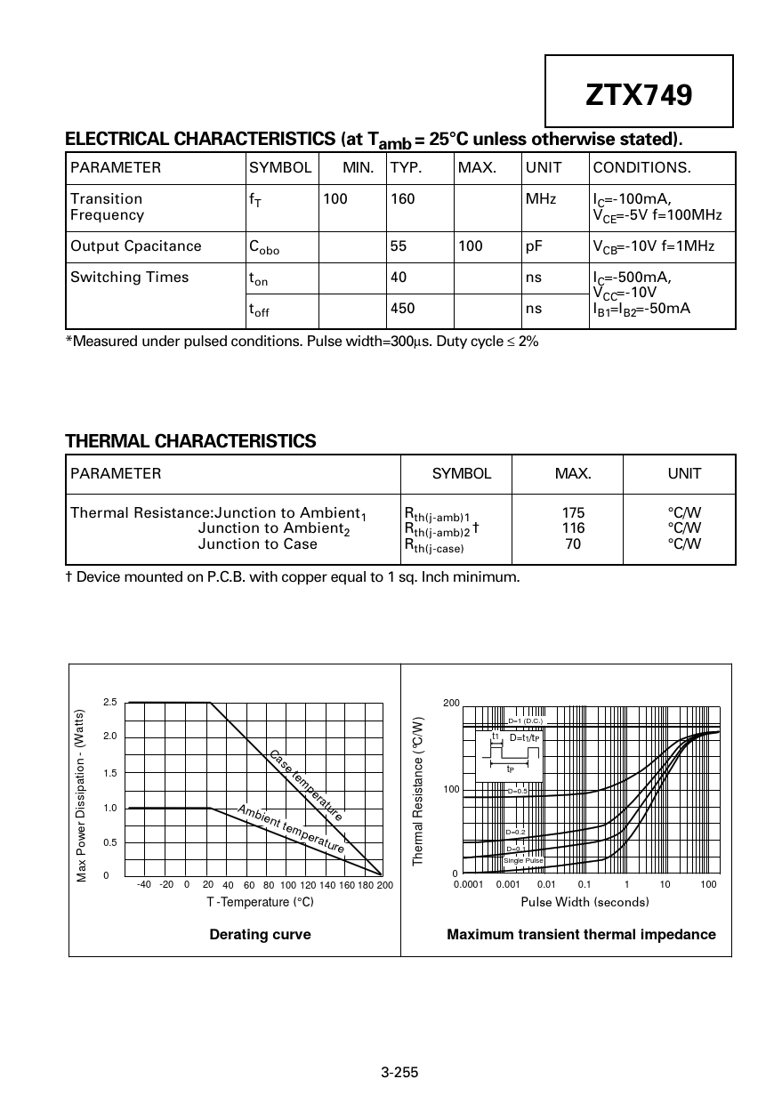 PNP SILICON PLANAR ZTX749 MEDIUM POWER TRANSISTOR ZTX749 ISSUE 1 – APRIL 94 ELECTRICAL CHARACTERISTICS (at Tamb = 25°C unless otherwise stated). FEATURES PARAMETER SYMBOL MIN. TYP. MAX. UNIT CONDITIONS. * 25 Volt VCEO * 2 Amp continuous current Transition fT 100 160 MHz IC=-100mA, * Low saturation voltage Frequency VCE=-5V f=100MHz Output Cpacitance C C obo 55 100 pF VCB=-10V f=1MHz B E Switching Times ton 40 ns IC=-500mA, E-Line VCC=-10V TO92 Compatible toff 450 ns IB1=IB2=-50mA ABSOLUTE MAXIMUM RATINGS. *Measured under pulsed conditions. Pulse width=300µs. Duty cycle ≤ 2% PARAMETER SYMBOL VALUE UNIT Collector-Base Voltage VCBO -35 V Collector-Emitter Voltage VCEO -25 V Emitter-Base Voltage VEBO -5 V Peak Pulse Current I THERMAL CHARACTERISTICS CM -6 A Continuous Collector Current IC -2 A PARAMETER SYMBOL MAX. UNIT Power Dissipation at Tamb=25°C Ptot 1 W derate above 25°C 5.7 mW/ °C Thermal Resistance:Junction to Ambient1 Rth(j-amb)1 175 °C/W Junction to Ambient R 116 °C/W Operating and Storage Temperature Range Tj:Tstg -55 to +200 °C 2 th(j-amb)2 † Junction to Case Rth(j-case) 70 °C/W ELECTRICAL CHARACTERISTICS (at Tamb = 25°C unless otherwise stated). † Device mounted on P.C.B. with copper equal to 1 sq. Inch minimum. PARAMETER SYMBOL MIN. TYP. MAX. UNIT CONDITIONS. Collector-Base V(BR)CBO -35 V IC=-100µA, IE=0 Breakdown Voltage Collector-Emitter V(BR)CEO -25 V IC=-10mA, IB=0* Breakdown Voltage 2.5 200 Emitter-Base V(BR)EBO -5 V IE=-100µA, IC=0 tts) D=1 (D.C.) a Breakdown Voltage W W 2.0 t1 D=t1/tP ( °C/ - Case temperature Collector Cut-Off ICBO -0.1 µA VCB=-30V n oi 1.5 nce ( tP Current -10 µA VCB=-30V,Tamb=100°C ta 100 sipat D=0.5 Emitter Cut-Off Current I is Ambient temperat esis EBO -0.1 µA VEB=-4V, IE=0 1.0 Dr l R a D=0.2 Collector-Emitter VCE(sat) -0.12 -0.3 V IC=1A, IB=-100mA* we 0.5 ur rm e e D=0.1 Saturation Voltage -0.23 -0.5 V IC=2A, IB=-200mA* h Single Pulse ax Po T M 0 0 Base-Emitter VBE(sat) -0.9 -1.25 V IC=1A, IB=-100mA* -40 -20 0 20 40 60 80 100 120 140 160 180 200 0.0001 0.001 0.01 0.1 1 10 100 Saturation Voltage T -Temperature (°C) Pulse Width (seconds) Base-Emitter VBE(on) -0.8 -1 V IC=-1A, VCE=-2V*