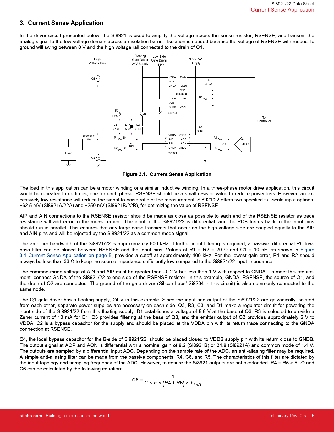 link to page 5 link to page 5 Si8921/22 Data Sheet Current Sense Application 3. Current Sense Application In the driver circuit presented below, the Si8921 is used to amplify the voltage across the sense resistor, RSENSE, and transmit the analog signal to the low-voltage domain across an isolation barrier. Isolation is needed because the voltage of RSENSE with respect to ground will swing between 0 V and the high voltage rail connected to the drain of Q1. Floating Low Side High Gate Driver 3.3 to 5V Gate Driver Voltage Bus 24V Supply Supply Supply VDDA PWM Q1 C5 VOA 0.1uF GNDA VDDI GNDI DISABLE R6 VDDB DT VOB GNDB VDDI R3 Si8234 Q3 1.82K To Controller C3 D1 C2 C4 0.1uF 5.6V 0.1uF 0.1uF 1 VDDA VDDB 8 RSENSE R1 20 2 R4 AIP AOP 7 + C1 3 AIN AON 6 C6 ADC 10nF 4 R2 20 GNDA GNDB 5 R5 _ Load Si8921 Q2 Figure 3.1. Current Sense Application The load in this application can be a motor winding or a similar inductive winding. In a three-phase motor drive application, this circuit would be repeated three times, one for each phase. RSENSE should be a small resistor value to reduce power loss. However, an ex- cessively low resistance will reduce the signal-to-noise ratio of the measurement. Si8921/22 offers two specified full-scale input options, ±62.5 mV (Si8921A/22A) and ±250 mV (Si8921B/22B), for optimizing the value of RSENSE. AIP and AIN connections to the RSENSE resistor should be made as close as possible to each end of the RSENSE resistor as trace resistance will add error to the measurement. The input to the Si8921/22 is differential, and the PCB traces back to the input pins should run in parallel. This ensures that any large noise transients that occur on the high-voltage side are coupled equally to the AIP and AIN pins and will be rejected by the Si8921/22 as a common-mode signal. The amplifier bandwidth of the Si8921/22 is approximately 600 kHz. If further input filtering is required, a passive, differential RC low- pass filter can be placed between RSENSE and the input pins. Values of R1 = R2 = 20 Ω and C1 = 10 nF, as shown in Figure 3.1 Current Sense Application on page 5, provides a cutoff at approximately 400 kHz. For the lowest gain error, R1 and R2 should always be less than 33 Ω to keep the source impedance sufficiently low compared to the Si8921/22 input impedance. The common-mode voltage of AIN and AIP must be greater than –0.2 V but less than 1 V with respect to GNDA. To meet this require- ment, connect GNDA of the Si8921/22 to one side of the RSENSE resistor. In this example, GNDA, RSENSE, the source of Q1, and the drain of Q2 are connected. The ground of the gate driver (Silicon Labs’ Si8234 in this circuit) is also commonly connected to the same node. The Q1 gate driver has a floating supply, 24 V in this example. Since the input and output of the Si8921/22 are galvanically isolated from each other, separate power supplies are necessary on each side. Q3, R3, C3, and D1 make a regulator circuit for powering the input side of the Si8921/22 from this floating supply. D1 establishes a voltage of 5.6 V at the base of Q3. R3 is selected to provide a Zener current of 10 mA for D1. C3 provides filtering at the base of Q3, and the emitter output of Q3 provides approximately 5 V to VDDA. C2 is a bypass capacitor for the supply and should be placed at the VDDA pin with its return trace connecting to the GNDA connection at RSENSE. C4, the local bypass capacitor for the B-side of Si8921/22, should be placed closed to VDDB supply pin with its return close to GNDB. The output signal at AOP and AON is differential with a nominal gain of 8.2 (Si8921B) or 34.8 (Si8921A) and common mode of 1.4 V. The outputs are sampled by a differential input ADC. Depending on the sample rate of the ADC, an anti-aliasing filter may be required. A simple anti-aliasing filter can be made from the passive components, R4, C6, and R5. The characteristics of this filter are dictated by the input topology and sampling frequency of the ADC. However, to ensure the Si8921 outputs are not overloaded, R4 = R5 > 5 kΩ and C6 can be calculated by the following equation: 1 C6 = 2 × π × (R4 + R5) × f3dB silabs.com | Building a more connected world. Preliminary Rev. 0.5 | 5 Document Outline 1. Ordering Guide 2. System Overview 3. Current Sense Application 4. Electrical Specifications 4.1 Regulatory Information 4.2 Typical Operating Characteristics 5. Pin Descriptions 5.1 Si8921 Pin Descriptions 5.2 Si8922 Pin Descriptions 6. Packaging 6.1 Package Outline: 8-Pin Wide Body Stretched SOIC 6.2 Package Outline: 8-Pin Narrow Body SOIC 6.3 Land Pattern: 8-Pin Wide Body Stretched SOIC 6.4 Land Pattern: 8-Pin Narrow Body SOIC 6.5 Top Marking: 8-Pin Wide Body Stretched SOIC 6.6 Top Marking: 8-Pin Narrow Body SOIC 7. Revision History