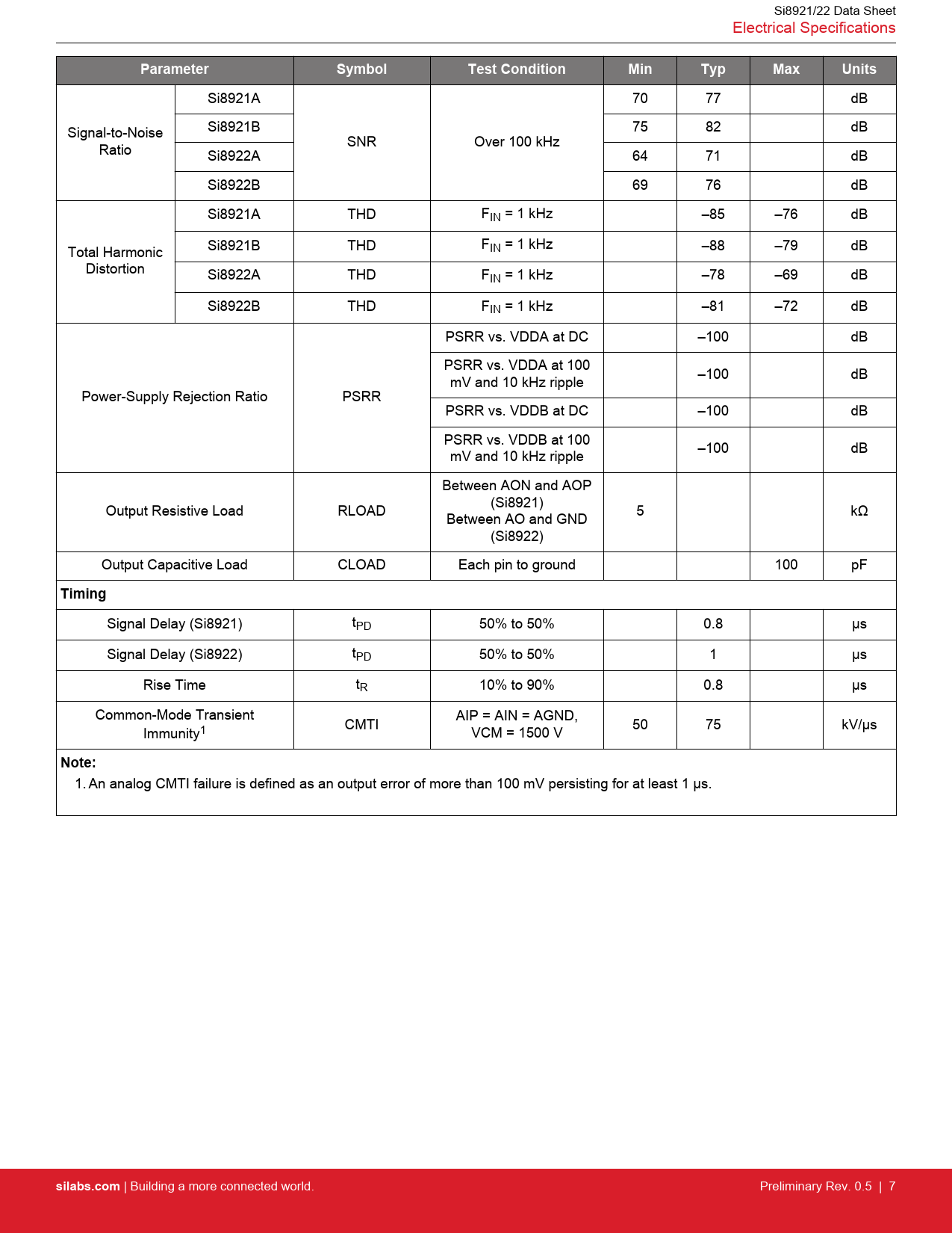 Si8921A 70 77 dB Signal-to-Noise Si8921B 75 82 dB SNR Over 100 kHz Ratio Si8922A 64 71 dB Si8922B 69 76 dB Si8921A THD FIN = 1 kHz –85 –76 dB Total Harmonic Si8921B THD FIN = 1 kHz –88 –79 dB Distortion Si8922A THD FIN = 1 kHz –78 –69 dB Si8922B THD FIN = 1 kHz –81 –72 dB PSRR vs. VDDA at DC –100 dB PSRR vs. VDDA at 100 –100 dB mV and 10 kHz ripple Power-Supply Rejection Ratio PSRR PSRR vs. VDDB at DC –100 dB PSRR vs. VDDB at 100 –100 dB mV and 10 kHz ripple Between AON and AOP (Si8921) Output Resistive Load RLOAD 5 kΩ Between AO and GND (Si8922) Output Capacitive Load CLOAD Each pin to ground 100 pF