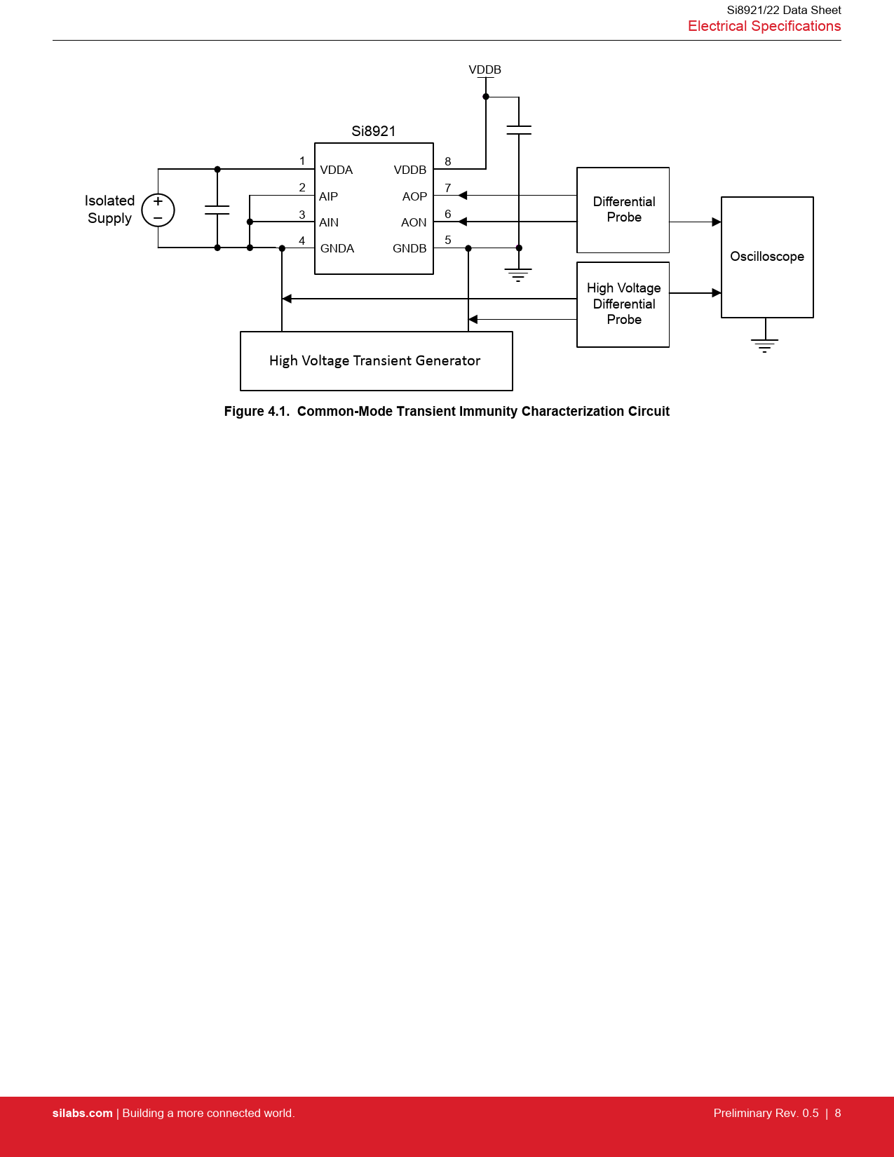 Si8921/22 Data Sheet Electrical Specifications VDDB Si8921 1 8 VDDA VDDB 2 7 AIP AOP Isolated + Differential _ 3 6 Supply AIN AON Probe 4 5 GNDA GNDB Oscilloscope High Voltage Differential Probe High Voltage Transient Generator
