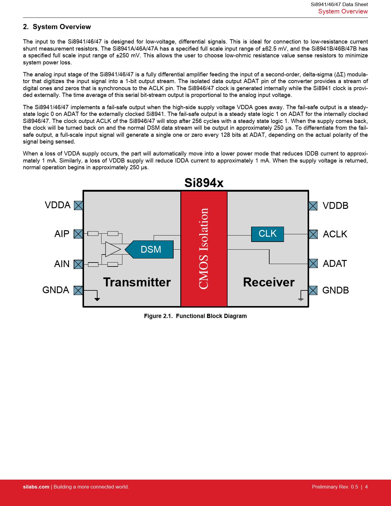 Si8941/46/47 Data Sheet System Overview 2. System Overview The input to the Si8941/46/47 is designed for low-voltage, differential signals. This is ideal for connection to low-resistance current shunt measurement resistors. The Si8941A/46A/47A has a specified full scale input range of ±62.5 mV, and the Si8941B/46B/47B has a specified full scale input range of ±250 mV. This allows the user to choose low-ohmic resistance value sense resistors to minimize system power loss. The analog input stage of the Si8941/46/47 is a fully differential amplifier feeding the input of a second-order, delta-sigma (ΔΣ) modula- tor that digitizes the input signal into a 1-bit output stream. The isolated data output ADAT pin of the converter provides a stream of digital ones and zeros that is synchronous to the ACLK pin. The Si8946/47 clock is generated internally while the Si8941 clock is provi- ded externally. The time average of this serial bit-stream output is proportional to the analog input voltage. The Si8941/46/47 implements a fail-safe output when the high-side supply voltage VDDA goes away. The fail-safe output is a steady- state logic 0 on ADAT for the externally clocked Si8941. The fail-safe output is a steady state logic 1 on ADAT for the internally clocked Si8946/47. The clock output ACLK of the Si8946/47 will stop after 256 cycles with a steady state logic 1. When the supply comes back, the clock will be turned back on and the normal DSM data stream will be output in approximately 250 μs. To differentiate from the fail- safe output, a full-scale input signal will generate a single one or zero every 128 bits at ADAT, depending on the actual polarity of the signal being sensed. When a loss of VDDA supply occurs, the part will automatically move into a lower power mode that reduces IDDB current to approxi- mately 1 mA. Similarly, a loss of VDDB supply will reduce IDDA current to approximately 1 mA. When the supply voltage is returned, normal operation begins in approximately 250 μs. Si894x VDDA VDDB AIP CLK ACLK DSM AIN ADAT TransmitterReceiver GNDA CMOS Isolation GNDB Figure 2.1. Functional Block Diagramsilabs.com | Building a more connected world. Preliminary Rev. 0.5 | 4 Document Outline 1. Ordering Guide 2. System Overview 2.1 Modulator 3. Current Sense Application 4. Electrical Specifications 4.1 Regulatory Information 4.2 Typical Operating Characteristics 5. Pin Descriptions 6. Packaging 6.1 Package Outline: 8-Pin Wide Body Stretched SOIC 6.2 Package Outline: 8-Pin Narrow Body SOIC 6.3 Land Pattern: 8-Pin Wide Body Stretched SOIC 6.4 Land Pattern: 8-Pin Narrow Body SOIC 6.5 Top Marking: 8-Pin Wide Body Stretched SOIC 6.6 Top Marking: 8-Pin Narrow Body SOIC 7. Revision History