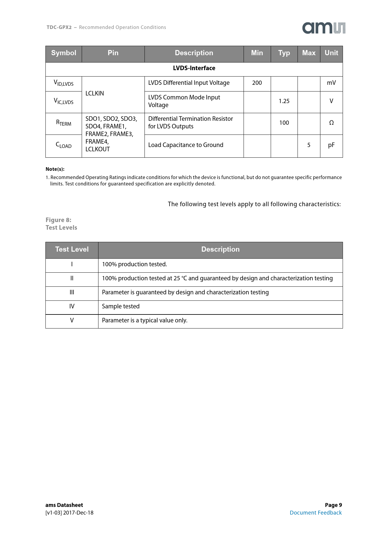 TDC-GPX2 −. Symbol. Pin. Description. Min. Typ. Max. Unit. LVDS-Interface. Note(s):. Figure 8: Test Levels. Test Level. ams Datasheet. Page 9