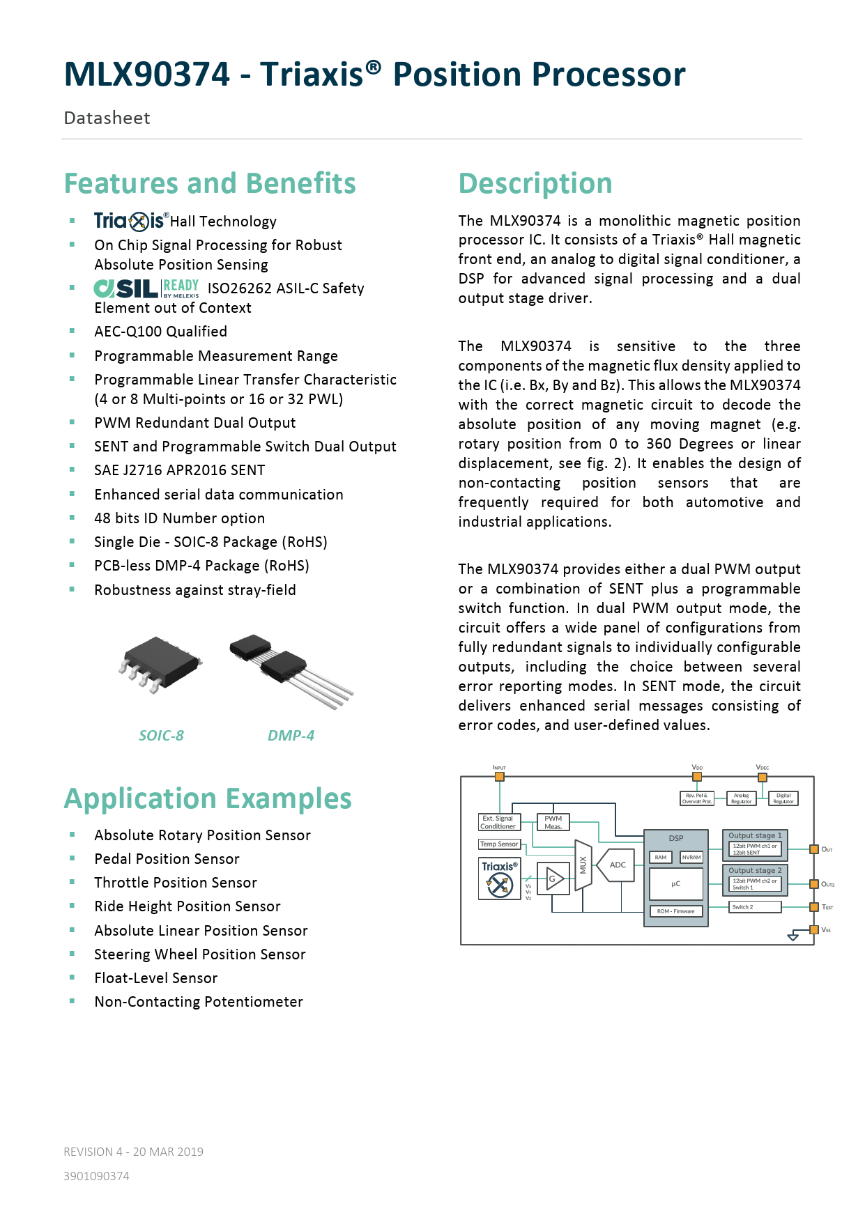 link to page 6 MLX90374 - Triaxis® Position Processor Datasheet Features and BenefitsDescription Triaxis Hal Technology The MLX90374 is a monolithic magnetic position On Chip Signal Processing for Robust processor IC. It consists of a Triaxis® Hall magnetic Absolute Position Sensing front end, an analog to digital signal conditioner, a DSP for advanced signal processing and a dual ISO26262 ASIL-C Safety Element out of Context output stage driver. AEC-Q100 Qualified The MLX90374 is sensitive to the three Programmable Measurement Range components of the magnetic flux density applied to Programmable Linear Transfer Characteristic the IC (i.e. Bx, By and Bz). This allows the MLX90374 (4 or 8 Multi-points or 16 or 32 PWL) with the correct magnetic circuit to decode the PWM Redundant Dual Output absolute position of any moving magnet (e.g. SENT and Programmable Switch Dual Output rotary position from 0 to 360 Degrees or linear SAE J2716 APR2016 SENT displacement, see fig. 2). It enables the design of non-contacting position sensors that are Enhanced serial data communication frequently required for both automotive and 48 bits ID Number option industrial applications. Single Die - SOIC-8 Package (RoHS) PCB-less DMP-4 Package (RoHS) The MLX90374 provides either a dual PWM output Robustness against stray-field or a combination of SENT plus a programmable switch function. In dual PWM output mode, the circuit offers a wide panel of configurations from fully redundant signals to individually configurable outputs, including the choice between several error reporting modes. In SENT mode, the circuit delivers enhanced serial messages consisting of error codes, and user-defined values. SOIC-8DMP-4Application Examples Absolute Rotary Position Sensor Pedal Position Sensor Throttle Position Sensor Ride Height Position Sensor Absolute Linear Position Sensor Steering Wheel Position Sensor Float-Level Sensor Non-Contacting Potentiometer REVISION 4 - 20 MAR 2019 3901090374 Document Outline Features and Benefits Application Examples Description Ordering Information 1. Functional Diagram and Application Modes 2. Glossary of Terms 3. Pin Definitions and Descriptions 3.1. Pin Definition for SOIC-8 package 3.2. Pin Definition for DMP 4. Absolute Maximum Ratings 5. General Electrical Specifications 6. Timing Specification 6.1. General Timing Specifications 6.2. Timing Modes 6.2.1. Continuous Asynchronous Acquisition Mode 6.2.2. Continuous Synchronous Acquisition Mode 6.3. Timing Definitions 6.3.1. Startup Time 6.3.1.1. Normal Startup 6.3.1.2. Safe Startup 6.3.1.3. Startup phase in PWM mode 6.3.2. Latency (average) 6.3.3. Step Response (worst case) 6.4. PWM timing specifications 6.5. SENT timing specifications 7. Magnetic Field Specifications 7.1. Rotary Stray-field Immune Mode (-100 code) 7.2. Linear Stray-field Immune (-200 code) 7.3. Standard/Legacy Mode (-300 code) 8. Accuracy Specifications 8.1. Definition 8.1.1. Intrinsic Linearity Error 8.1.2. Total Angle Drift 8.2. Rotary Stray-field Immune (-100 code) 8.2.1. Nominal Performance 8.2.2. Limited Performances 8.3. Linear Stray-field Immune Mode (-200 code) 8.3.1. Nominal Performances 8.3.2. Limited Performances 8.4. Standard/Legacy Mode (-300 code) 8.4.1. Nominal Performances 8.4.2. Limited Performances 9. Memory Specifications 10. Digital output protocol 10.1. PWM (pulse width modulation) 10.1.1. Definition 10.1.2. PWM performances 10.2. Single Edge Nibble Transmission (SENT) SAE J2716 10.2.1. Sensor message definition 10.2.2. Sensor message frame contents 10.2.3. Single secure sensor A.3 10.2.4. Dual Throttle position sensor A.1 10.2.5. Start-up behaviour 10.2.6. SENT Output Timing configuration 10.2.7. Serial message channel (slow channel) 10.2.8. Serial Message Error Code 10.2.9. SENT configuration shorthand definition 11. End-User Programmable Items 11.1. End User Identification Items 12. Description of End-User Programmable Items 12.1. Sensor Front-End 12.1.1. SENSING MODE 12.1.2. GAINMIN and GAINMAX Parameters 12.2. Sensor DSP Configuration 12.2.1. Discontinuity Point (or Zero Degree Point) 12.2.2. CW (Clockwise) Parameter 12.2.3. Filter 12.2.3.1. FIR Filter 12.2.3.2. Exponential Moving Average (IIR) Filter 12.2.4. WORKING_RANGE Parameter for Angle Range Selection 12.2.5. WORK_RANGE_GAIN Parameter for Angle Range Selection 12.2.6. Piecewise Linear Transform 12.2.6.1. 4-Pts LNR Parameters 12.2.6.2. 8-Pts LNR Parameters 12.2.6.3. 17-Pts LNR Parameters 12.2.6.4. 32-Pts LNR parameters 12.2.7. Scaling Parameter 12.2.8. Thermal offset correction - OUTSLOPE 12.2.9. Second Output Gain and Offset Parameters 12.2.10. CLAMPING Parameters 12.3. Selection of Output modes 12.3.1. Digital Output Protocol (PROTOCOL) 12.3.2. PWM Output Polarity and Frequency 12.3.3. PWM Redundant Output 12.3.4. Dual PWM fault Reporting Mode 12.3.5. OUT mode (ABE_OUT_MODE) 12.3.6. SENT Serial Channel Configuration - Status and Communication Nibble 12.3.7. Switch Function (Kickdown) 12.4. Programmable Diagnostics Settings 12.4.1. Diagnostics Global Enable 12.4.2. Diagnostic Debouncer 12.4.3. Over/Under Temperature Diagnostic 12.4.4. PWM Diagnostic 13. Functional Safety 13.1. Safety Manual 13.2. Safety Mechanisms 14. Recommended Application Diagrams 14.1. Wiring with the MLX90374 in SOIC-8 Package 14.2. Wiring with the MLX90374 in DMP-4 Package (built-in capacitors) 15. Standard information regarding manufacturability of Melexis products with different soldering processes 16. ESD Precautions 17. Package Information 17.1. SOIC-8 - Package Dimensions 17.2. SOIC-8 - Pinout and Marking 17.3. SOIC-8 - Sensitive spot positioning 17.3.1. Rotary Stray-field Immune and Standard Mode Applications 17.3.2. Linear Stray-field Immune Applications 17.4. SOIC-8 - Angle detection 17.5. DMP-4 - Package Outline Dimensions (POD) STD1 1.27 17.6. DMP-4 - Package Outline Dimensions (POD) STD3 2.00 17.7. DMP-4 - Marking 17.8. DMP-4 - Sensitive Spot Positioning 17.8.1. Rotary Stray-field Immune or Standard Mode Ap