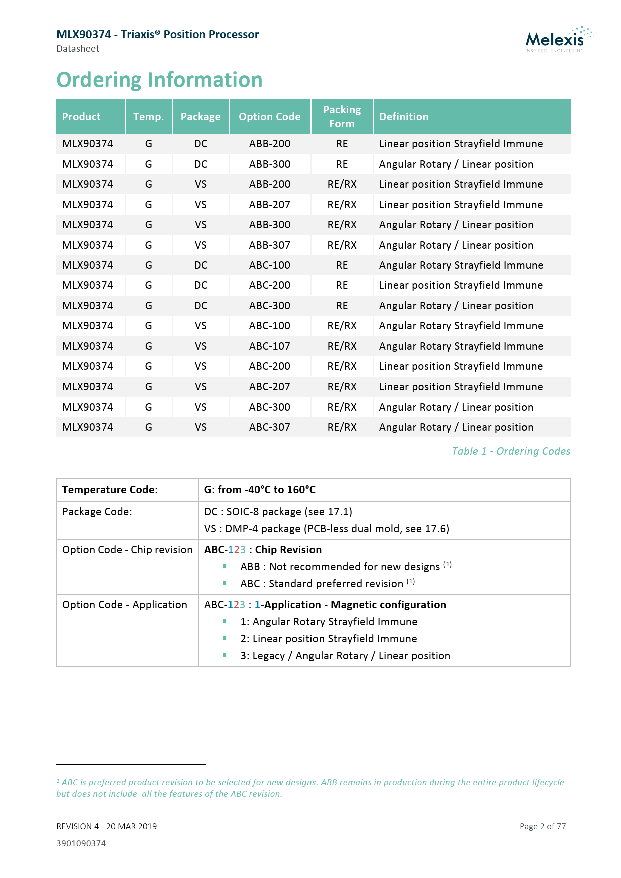 link to page 69 link to page 73 link to page 2 link to page 2 MLX90374 - Triaxis® Position Processor Datasheet Ordering InformationProductTemp. PackageOption CodePackingFormDefinition MLX90374 G DC ABB-200 RE Linear position Strayfield Immune MLX90374 G DC ABB-300 RE Angular Rotary / Linear position MLX90374 G VS ABB-200 RE/RX Linear position Strayfield Immune MLX90374 G VS ABB-207 RE/RX Linear position Strayfield Immune MLX90374 G VS ABB-300 RE/RX Angular Rotary / Linear position MLX90374 G VS ABB-307 RE/RX Angular Rotary / Linear position MLX90374 G DC ABC-100 RE Angular Rotary Strayfield Immune MLX90374 G DC ABC-200 RE Linear position Strayfield Immune MLX90374 G DC ABC-300 RE Angular Rotary / Linear position MLX90374 G VS ABC-100 RE/RX Angular Rotary Strayfield Immune MLX90374 G VS ABC-107 RE/RX Angular Rotary Strayfield Immune MLX90374 G VS ABC-200 RE/RX Linear position Strayfield Immune MLX90374 G VS ABC-207 RE/RX Linear position Strayfield Immune MLX90374 G VS ABC-300 RE/RX Angular Rotary / Linear position MLX90374 G VS ABC-307 RE/RX Angular Rotary / Linear position Table 1 - Ordering Codes Temperature Code:G: from -40°C to 160°C Package Code: DC : SOIC-8 package (see 17.1) VS : DMP-4 package (PCB-less dual mold, see 17.6) Option Code - Chip revision ABC -123 : Chip Revision ABB : Not recommended for new designs (1) ABC : Standard preferred revision (1) Option Code - Application ABC- 1 23 : 1 - Application - Magnetic configuration 1: Angular Rotary Strayfield Immune 2: Linear position Strayfield Immune 3: Legacy / Angular Rotary / Linear position 1 ABC is preferred product revision to be selected for new designs. ABB remains in production during the entire product lifecycle but does not include al the features of the ABC revision. REVISION 4 - 20 MAR 2019 Page 2 of 77 3901090374 Document Outline Features and Benefits Application Examples Description Ordering Information 1. Functional Diagram and Application Modes 2. Glossary of Terms 3. Pin Definitions and Descriptions 3.1. Pin Definition for SOIC-8 package 3.2. Pin Definition for DMP 4. Absolute Maximum Ratings 5. General Electrical Specifications 6. Timing Specification 6.1. General Timing Specifications 6.2. Timing Modes 6.2.1. Continuous Asynchronous Acquisition Mode 6.2.2. Continuous Synchronous Acquisition Mode 6.3. Timing Definitions 6.3.1. Startup Time 6.3.1.1. Normal Startup 6.3.1.2. Safe Startup 6.3.1.3. Startup phase in PWM mode 6.3.2. Latency (average) 6.3.3. Step Response (worst case) 6.4. PWM timing specifications 6.5. SENT timing specifications 7. Magnetic Field Specifications 7.1. Rotary Stray-field Immune Mode (-100 code) 7.2. Linear Stray-field Immune (-200 code) 7.3. Standard/Legacy Mode (-300 code) 8. Accuracy Specifications 8.1. Definition 8.1.1. Intrinsic Linearity Error 8.1.2. Total Angle Drift 8.2. Rotary Stray-field Immune (-100 code) 8.2.1. Nominal Performance 8.2.2. Limited Performances 8.3. Linear Stray-field Immune Mode (-200 code) 8.3.1. Nominal Performances 8.3.2. Limited Performances 8.4. Standard/Legacy Mode (-300 code) 8.4.1. Nominal Performances 8.4.2. Limited Performances 9. Memory Specifications 10. Digital output protocol 10.1. PWM (pulse width modulation) 10.1.1. Definition 10.1.2. PWM performances 10.2. Single Edge Nibble Transmission (SENT) SAE J2716 10.2.1. Sensor message definition 10.2.2. Sensor message frame contents 10.2.3. Single secure sensor A.3 10.2.4. Dual Throttle position sensor A.1 10.2.5. Start-up behaviour 10.2.6. SENT Output Timing configuration 10.2.7. Serial message channel (slow channel) 10.2.8. Serial Message Error Code 10.2.9. SENT configuration shorthand definition 11. End-User Programmable Items 11.1. End User Identification Items 12. Description of End-User Programmable Items 12.1. Sensor Front-End 12.1.1. SENSING MODE 12.1.2. GAINMIN and GAINMAX Parameters 12.2. Sensor DSP Configuration 12.2.1. Discontinuity Point (or Zero Degree Point) 12.2.2. CW (Clockwise) Parameter 12.2.3. Filter 12.2.3.1. FIR Filter 12.2.3.2. Exponential Moving Average (IIR) Filter 12.2.4. WORKING_RANGE Parameter for Angle Range Selection 12.2.5. WORK_RANGE_GAIN Parameter for Angle Range Selection 12.2.6. Piecewise Linear Transform 12.2.6.1. 4-Pts LNR Parameters 12.2.6.2. 8-Pts LNR Parameters 12.2.6.3. 17-Pts LNR Parameters 12.2.6.4. 32-Pts LNR parameters 12.2.7. Scaling Parameter 12.2.8. Thermal offset correction - OUTSLOPE 12.2.9. Second Output Gain and Offset Parameters 12.2.10. CLAMPING Parameters 12.3. Selection of Output modes 12.3.1. Digital Output Protocol (PROTOCOL) 12.3.2. PWM Output Polarity and Frequency 12.3.3. PWM Redundant Output 12.3.4. Dual PWM fault Reporting Mode 12.3.5. OUT mode (ABE_OUT_MODE) 12.3.6. SENT Serial Channel Configuration - Status and Communication Nibble 12.3.7. Switch Function (Kickdown) 12.4. Programmable Diagnostics Settings 12.4.1. Diagnostics Global Enable 12.4.2. Diagnostic Debouncer 12.4.3. Over/Under Temperature Diagnostic 12.4.4. PWM Diagnostic 13. Functional Safety 13.1. Safety Manual 13.2. Safety Mechanisms 14. Recommended Application Diagrams 14.1. Wiring with the MLX90374 in SOIC-8 Package 14.2. Wiring with the MLX90374 in DMP-4 Package (built-in capacitors) 15. Standard information regarding manufacturability of Melexis products with different soldering processes 16. ESD Precautions 17. Package Information 17.1. SOIC-8 - Package Dimensions 17.2. SOIC-8 - Pinout and Marking 17.3. SOIC-8 - Sensitive spot positioning 17.3.1. Rotary Stray-field Immune and Standard Mode Applications 17.3.2. Linear Stray-field Immune Applications 17.4. SOIC-8 - Angle detection 17.5. DMP-4 - Package Outline Dimensions (POD) STD1 1.27 17.6. DMP-4 - Package Outline Dimensions (POD) STD3 2.00 17.7. DMP-4 - Marking 17.8. DMP-4 - Sensitive Spot Positioning 17.8.1. Rotary Stray-field Immune or Standard Mode Applications 17.8.2. Linear Stray-field Immune Applications 17.9. DMP-4 - Angle detection 17.10. Packages Thermal Performances 18. Contact 19. Disclaimer 20. Revision Hi