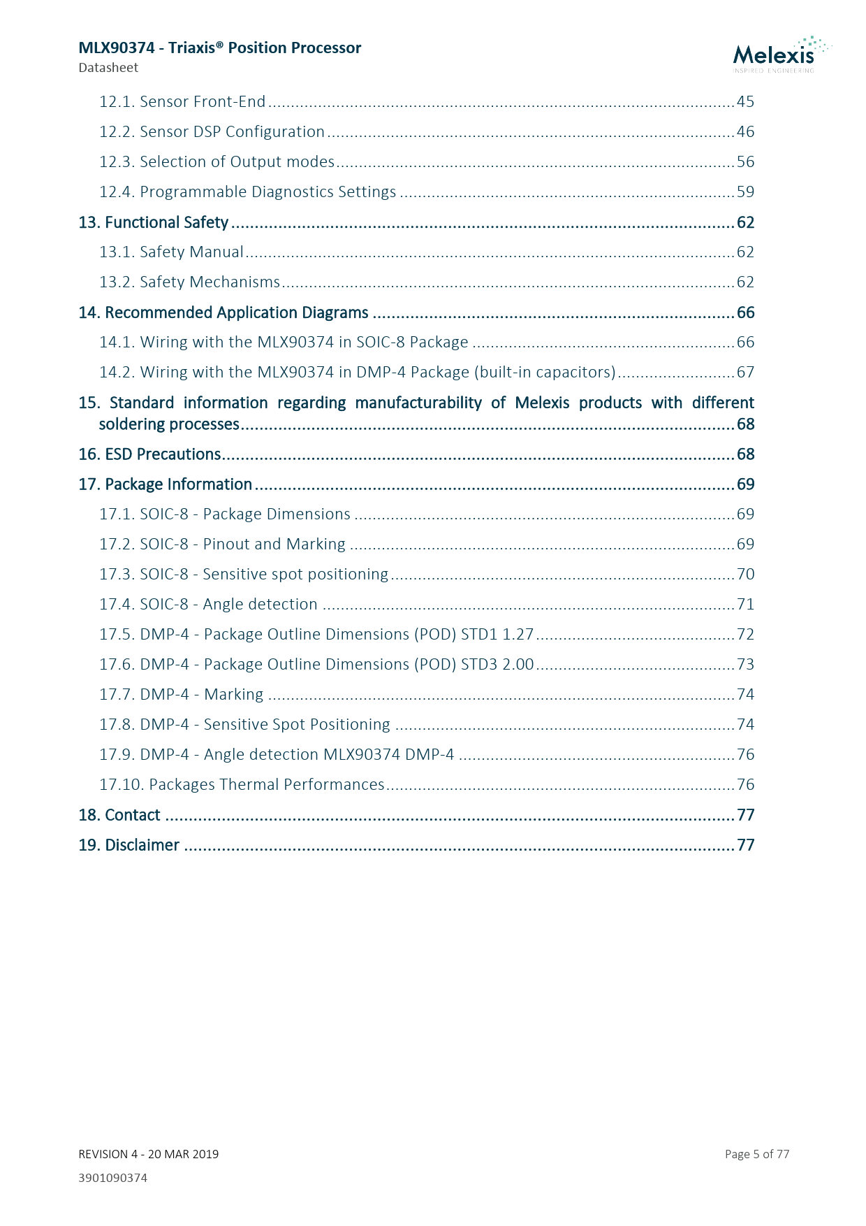 link to page 45 link to page 45 link to page 45 link to page 46 link to page 46 link to page 46 link to page 56 link to page 56 link to page 56 link to page 59 link to page 59 link to page 59 link to page 62 link to page 62 link to page 62 link to page 62 link to page 62 link to page 62 link to page 62 link to page 62 link to page 62 link to page 66 link to page 66 link to page 66 link to page 66 link to page 66 link to page 66 link to page 67 link to page 67 link to page 67 link to page 68 link to page 68 link to page 68 link to page 68 link to page 68 link to page 68 link to page 68 link to page 69 link to page 69 link to page 69 link to page 69 link to page 69 link to page 69 link to page 69 link to page 69 link to page 69 link to page 70 link to page 70 link to page 70 link to page 71 link to page 71 link to page 71 link to page 72 link to page 72 link to page 72 link to page 73 link to page 73 link to page 73 link to page 74 link to page 74 link to page 74 link to page 74 link to page 74 link to page 74 link to page 76 link to page 76 link to page 76 link to page 76 link to page 76 link to page 76 link to page 77 link to page 77 link to page 77 link to page 77 link to page 77 link to page 77 MLX90374 - Triaxis® Position Processor Datasheet 12.1. Sensor Front-End ... 45 12.2. Sensor DSP Configuration .. 46 12.3. Selection of Output modes .. 56 12.4. Programmable Diagnostics Settings .. 59 13. Functional Safety ... 62 13.1. Safety Manual .. 62 13.2. Safety Mechanisms .. 62 14. Recommended Application Diagrams ... 66 14.1. Wiring with the MLX90374 in SOIC-8 Package .. 66 14.2. Wiring with the MLX90374 in DMP-4 Package (built-in capacitors) .. 67 15. Standard information regarding manufacturability of Melexis products with different soldering processes ... 68 16. ESD Precautions ... 68 17. Package Information .. 69 17.1. SOIC-8 - Package Dimensions .. 69 17.2. SOIC-8 - Pinout and Marking ... 69 17.3. SOIC-8 - Sensitive spot positioning .. 70 17.4. SOIC-8 - Angle detection ... 71 17.5. DMP-4 - Package Outline Dimensions (POD) STD1 1.27 .. 72 17.6. DMP-4 - Package Outline Dimensions (POD) STD3 2.00 .. 73 17.7. DMP-4 - Marking ... 74 17.8. DMP-4 - Sensitive Spot Positioning ... 74 17.9. DMP-4 - Angle detection MLX90374 DMP-4 ... 76 17.10. Packages Thermal Performances ... 76 18. Contact ... 77 19. Disclaimer ... 77 REVISION 4 - 20 MAR 2019 Page 5 of 77 3901090374 Document Outline Features and Benefits Application Examples Description Ordering Information 1. Functional Diagram and Application Modes 2. Glossary of Terms 3. Pin Definitions and Descriptions 3.1. Pin Definition for SOIC-8 package 3.2. Pin Definition for DMP 4. Absolute Maximum Ratings 5. General Electrical Specifications 6. Timing Specification 6.1. General Timing Specifications 6.2. Timing Modes 6.2.1. Continuous Asynchronous Acquisition Mode 6.2.2. Continuous Synchronous Acquisition Mode 6.3. Timing Definitions 6.3.1. Startup Time 6.3.1.1. Normal Startup 6.3.1.2. Safe Startup 6.3.1.3. Startup phase in PWM mode 6.3.2. Latency (average) 6.3.3. Step Response (worst case) 6.4. PWM timing specifications 6.5. SENT timing specifications 7. Magnetic Field Specifications 7.1. Rotary Stray-field Immune Mode (-100 code) 7.2. Linear Stray-field Immune (-200 code) 7.3. Standard/Legacy Mode (-300 code) 8. Accuracy Specifications 8.1. Definition 8.1.1. Intrinsic Linearity Error 8.1.2. Total Angle Drift 8.2. Rotary Stray-field Immune (-100 code) 8.2.1. Nominal Performance 8.2.2. Limited Performances 8.3. Linear Stray-field Immune Mode (-200 code) 8.3.1. Nominal Performances 8.3.2. Limited Performances 8.4. Standard/Legacy Mode (-300 code) 8.4.1. Nominal Performances 8.4.2. Limited Performances 9. Memory Specifications 10. Digital output protocol 10.1. PWM (pulse width modulation) 10.1.1. Definition 10.1.2. PWM performances 10.2. Single Edge Nibble Transmission (SENT) SAE J2716 10.2.1. Sensor message definition 10.2.2. Sensor message frame contents 10.2.3. Single secure sensor A.3 10.2.4. Dual Throttle position sensor A.1 10.2.5. Start-up behaviour 10.2.6. SENT Output Timing configuration 10.2.7. Serial message channel (slow channel) 10.2.8. Serial Message Error Code 10.2.9. SENT configuration shorthand definition 11. End-User Programmable Items 11.1. End User Identification Items 12. Description of End-User Programmable Items 12.1. Sensor Front-End 12.1.1. SENSING MODE 12.1.2. GAINMIN and GAINMAX Parameters 12.2. Sensor DSP Configuration 12.2.1. Discontinuity Point (or Zero Degree Point) 12.2.2. CW (Clockwise) Parameter 12.2.3. Filter 12.2.3.1. FIR Filter 12.2.3.2. Exponential Moving Average (IIR) Filter 12.2.4. WORKING_RANGE Parameter for Angle Range Selection 12.2.5. WORK_RANGE_GAIN Parameter for Angle Range Selection 12.2.6. Piecewise Linear Transform 12.2.6.1. 4-Pts LNR Parameters 12.2.6.2. 8-Pts LNR Parameters 12.2.6.3. 17-Pts LNR Parameters 12.2.6.4. 32-Pts LNR parameters 12.2.7. Scaling Parameter 12.2.8. Thermal offset correction - OUTSLOPE 12.2.9. Second Output Gain and Offset Parameters 12.2.10. CLAMPING Parameters 12.3. Selection of Output modes 12.3.1. Digital Output Protocol (PROTOCOL) 12.3.2. PWM Output Polarity and Frequency 12.3.3. PWM Redundant Output 12.3.4. Dual PWM fault Reporting Mode 12.3.5. OUT mode (ABE_OUT_MODE) 12.3.6. SENT Serial Channel Configuration - Status and Communication Nibble 12.3.7. Switch Function (Kickdown) 12.4. Programmable Diagnostics Settings 12.4.1. Diagnostics Global Enable 12.4.2. Diagnostic Debouncer 12.4.3. Over/Under Temperature Diagnostic 12.4.4. PWM Diagnostic 13. Functional Safety 13.1. Safety Manual 13.2. Safety Mechanisms 14. Recommended Application Diagrams 14.1. Wiring with the MLX90374 in SOIC-8 Package 14.2. Wiring with the MLX90374 in DMP-4 Package (built-in capacitors) 15. Standard information regarding manufacturability of Melexis products with different soldering processes 16. ESD Precautions 17. Package Information 17.1. SOIC-8 - Package Dimensions 17.2. SOIC-8 - Pinout and Marki