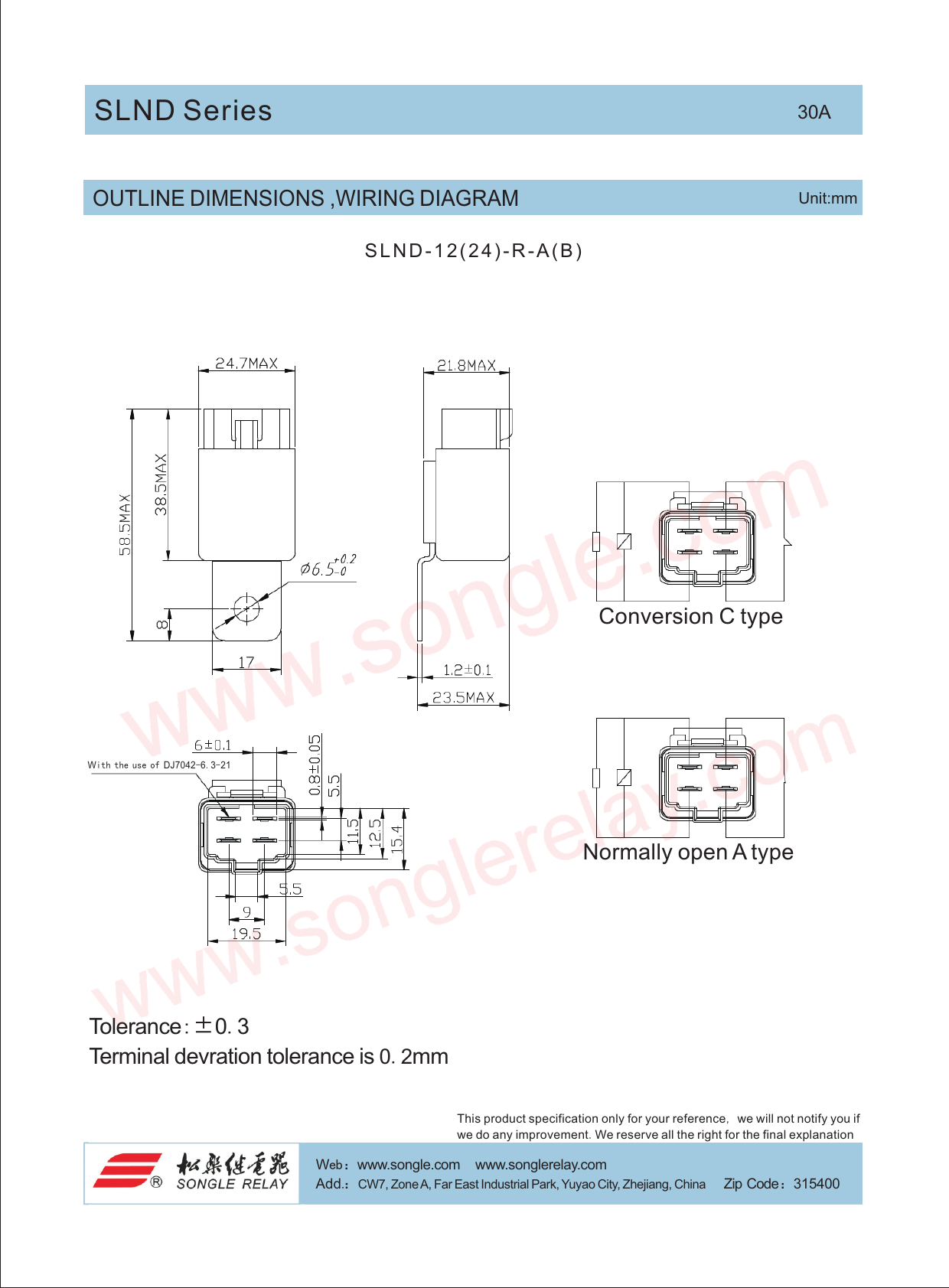 SLND Series 30A OUTLINE DIMENSIONS ,WIRING DIAGRAM Unit:mm S L N D - 1 2 ( 2 4 ) - R - A ( B ) Conversion C type With the use of DJ7042-6.3-21 Normally open A type Tolerance:±0.3 Terminal devration tolerance is 0.2mm This product specification only for your reference, we will not notify you if we do any improvement.We reserve all the right for the final explanation Web:www.songle.com www.songlerelay.com Email:sale@songle.com Web:www.songle.com www.songlerelay.com Add.:CW7, Zone A, Far East Industrial Park, Yuyao City, Zhejiang, China i Z p Code:315400 Add.:CW7, Zone A, Far East Industrial Park, Yuyao City, Zhejiang, China Zip Code:315400 Tel.: +86 574 62717777 62762658 62721968 a F x:+86 574 62721978 Document Outline 页 1 页 2