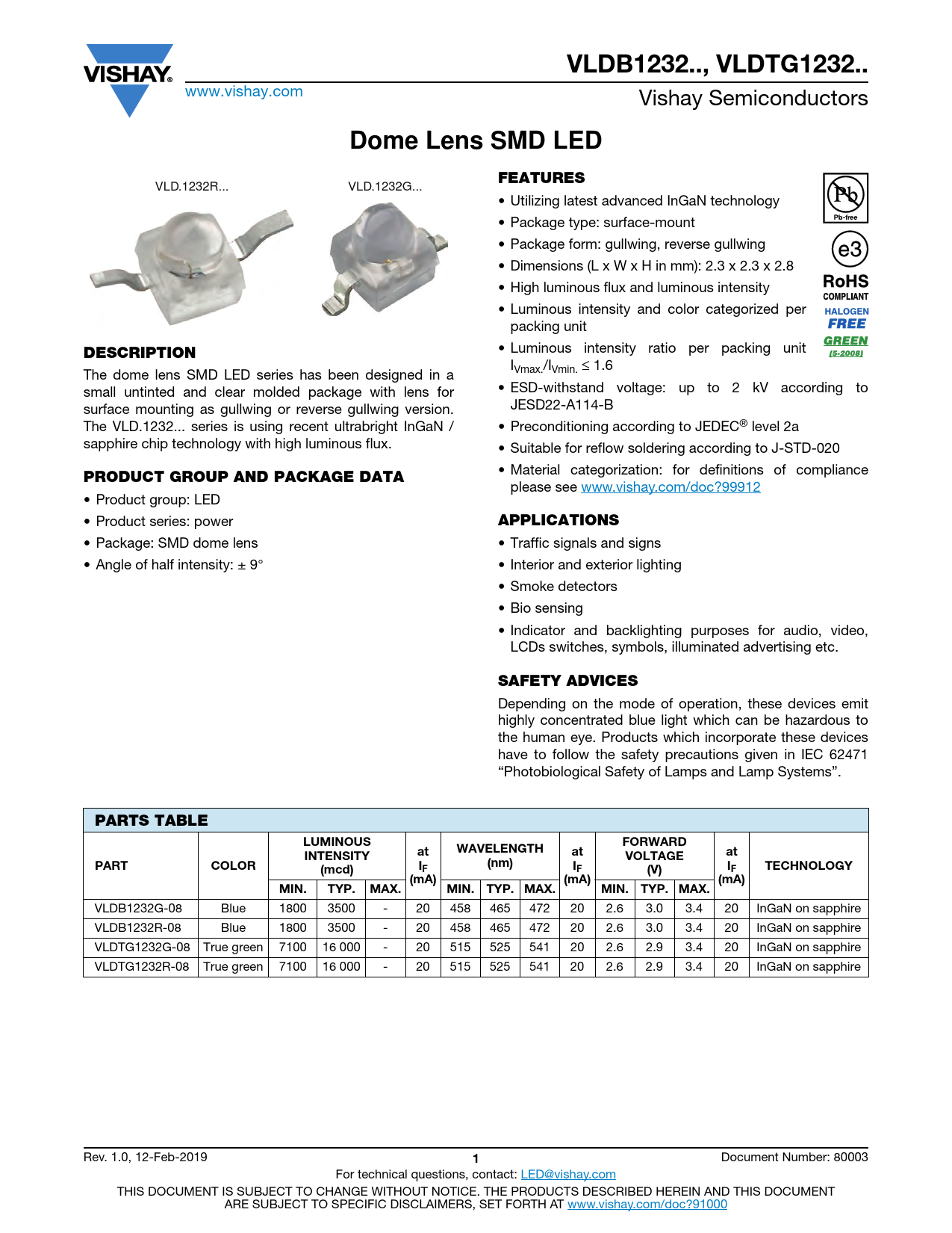 VLDB1232.., VLDTG1232.. www.vishay.com Vishay Semiconductors Dome Lens SMD LEDFEATURES VLD.1232R... VLD.1232G... • Utilizing latest advanced InGaN technology • Package type: surface-mount • Package form: gullwing, reverse gullwing • Dimensions (L x W x H in mm): 2.3 x 2.3 x 2.8 • High luminous flux and luminous intensity • Luminous intensity and color categorized per packing unit DESCRIPTION • Luminous intensity ratio per packing unit I The dome lens SMD LED series has been designed in a Vmax./IVmin. ≤ 1.6 small untinted and clear molded package with lens for • ESD-withstand voltage: up to 2 kV according to surface mounting as gullwing or reverse gullwing version. JESD22-A114-B The VLD.1232... series is using recent ultrabright InGaN / • Preconditioning according to JEDEC® level 2a sapphire chip technology with high luminous flux. • Suitable for reflow soldering according to J-STD-020 PRODUCT GROUP AND PACKAGE DATA • Material categorization: for definitions of compliance please see www.vishay.com/doc?99912 • Product group: LED • Product series: power APPLICATIONS • Package: SMD dome lens • Traffic signals and signs • Angle of half intensity: ± 9° • Interior and exterior lighting • Smoke detectors • Bio sensing • Indicator and backlighting purposes for audio, video, LCDs switches, symbols, illuminated advertising etc. SAFETY ADVICES Depending on the mode of operation, these devices emit highly concentrated blue light which can be hazardous to the human eye. Products which incorporate these devices have to follow the safety precautions given in IEC 62471 “Photobiological Safety of Lamps and Lamp Systems”. PARTS TABLELUMINOUSFORWARDWAVELENGTHINTENSITYatatVOLTAGEatPARTCOLOR(nm)(mcd)IFIF(V)IFTECHNOLOGY(mA)(mA)(mA)MIN.TYP.MAX.MIN.TYP. MAX.MIN.TYP. MAX. VLDB1232G-08 Blue 1800 3500 - 20 458 465 472 20 2.6 3.0 3.4 20 InGaN on sapphire VLDB1232R-08 Blue 1800 3500 - 20 458 465 472 20 2.6 3.0 3.4 20 InGaN on sapphire VLDTG1232G-08 True green 7100 16 000 - 20 515 525 541 20 2.6 2.9 3.4 20 InGaN on sapphire VLDTG1232R-08 True green 7100 16 000 - 20 515 525 541 20 2.6 2.9 3.4 20 InGaN on sapphire Rev. 1.0, 12-Feb-2019 1 Document Number: 80003 For technical questions, contact: LED@vishay.com THIS DOCUMENT IS SUBJECT TO CHANGE WITHOUT NOTICE. THE PRODUCTS DESCRIBED HEREIN AND THIS DOCUMENT ARE SUBJECT TO SPECIFIC DISCLAIMERS, SET FORTH AT www.vishay.com/doc?91000