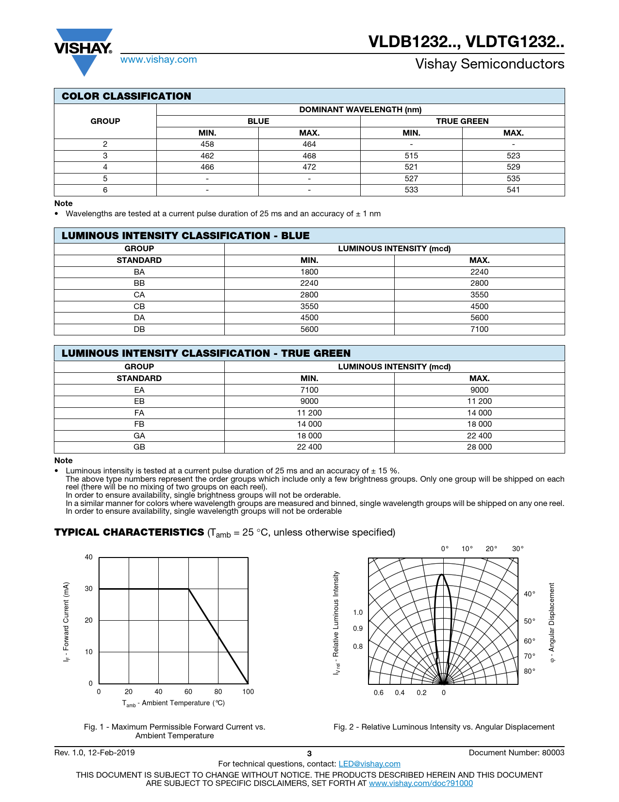 VLDB1232.., VLDTG1232.. www.vishay.com Vishay Semiconductors COLOR CLASSIFICATIONDOMINANT WAVELENGTH (nm)GROUPBLUETRUE GREENMIN.MAX.MIN.MAX. 2 458 464 - - 3 462 468 515 523 4 466 472 521 529 5 - - 527 535 6 - - 533 541 Note • Wavelengths are tested at a current pulse duration of 25 ms and an accuracy of ± 1 nm LUMINOUS INTENSITY CLASSIFICATION - BLUEGROUPLUMINOUS INTENSITY (mcd)STANDARDMIN.MAX. BA 1800 2240 BB 2240 2800 CA 2800 3550 CB 3550 4500 DA 4500 5600 DB 5600 7100 LUMINOUS INTENSITY CLASSIFICATION - TRUE GREENGROUPLUMINOUS INTENSITY (mcd)STANDARDMIN.MAX. EA 7100 9000 EB 9000 11 200 FA 11 200 14 000 FB 14 000 18 000 GA 18 000 22 400 GB 22 400 28 000 Note • Luminous intensity is tested at a current pulse duration of 25 ms and an accuracy of ± 15 %. The above type numbers represent the order groups which include only a few brightness groups. Only one group will be shipped on each reel (there will be no mixing of two groups on each reel). In order to ensure availability, single brightness groups will not be orderable. In a similar manner for colors where wavelength groups are measured and binned, single wavelength groups will be shipped on any one reel. In order to ensure availability, single wavelength groups will not be orderable TYPICAL CHARACTERISTICS (Tamb = 25 °C, unless otherwise specified) Axis Title Axis Tit 0° le 10° 20° 30° 40 10000 ty ) A 30 tensi ent (m n 40° 1000 urrent ne ne 1.0 ine inous I ne 20 ine 50° 1st li 0.9 2nd l 2nd li ard C 2nd l e Lum 2nd li v 100 60° orw ngular Displacem F elati 0.8 A - 10 R - 70° I F - l ϕ I V re 80° 0 10 0 20 40 60 80 100 0.6 0.4 0.2 0 T - Ambient Temperature (°C) amb 1st line 2nd line 2nd line Fig. 1 - Maximum Permissible Forward Current vs. Fig. 2 - Relative Luminous Intensity vs. Angular Displacement Ambient Temperature Rev. 1.0, 12-Feb-2019 3 Document Number: 80003 For technical questions, contact: LED@vishay.com THIS DOCUMENT IS SUBJECT TO CHANGE WITHOUT NOTICE. THE PRODUCTS DESCRIBED HEREIN AND THIS DOCUMENT ARE SUBJECT TO SPECIFIC DISCLAIMERS, SET FORTH AT www.vishay.com/doc?91000