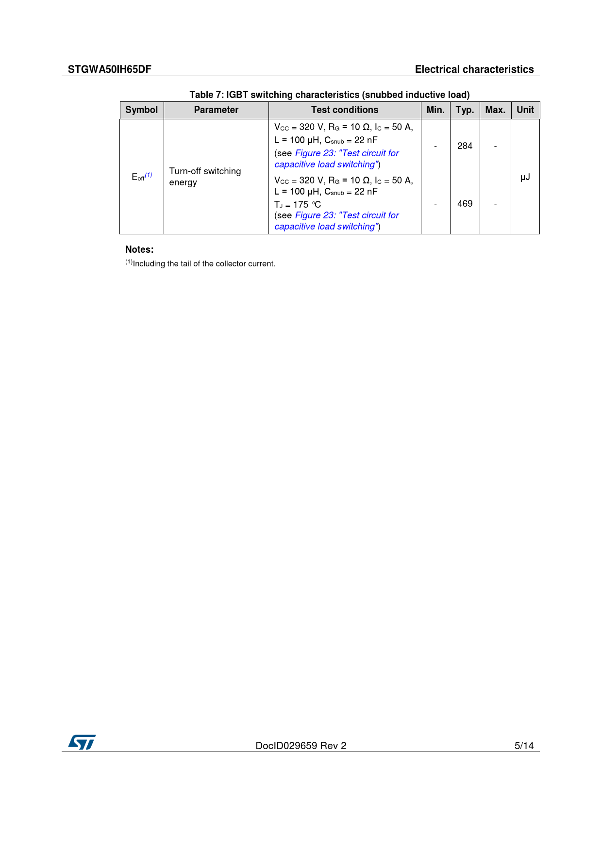 VCC = 320 V, RG = 10 Ω, IC = 50 A, L = 100 μH, Csnub = 22 nF - 284 - (see Figure 23: "Test circuit for capacitive load switching") Turn-off switching E (1) off μJ energy VCC = 320 V, RG = 10 Ω, IC = 50 A, L = 100 μH, Csnub = 22 nF TJ = 175 °C - 469 - (see Figure 23: "Test circuit for capacitive load switching")
