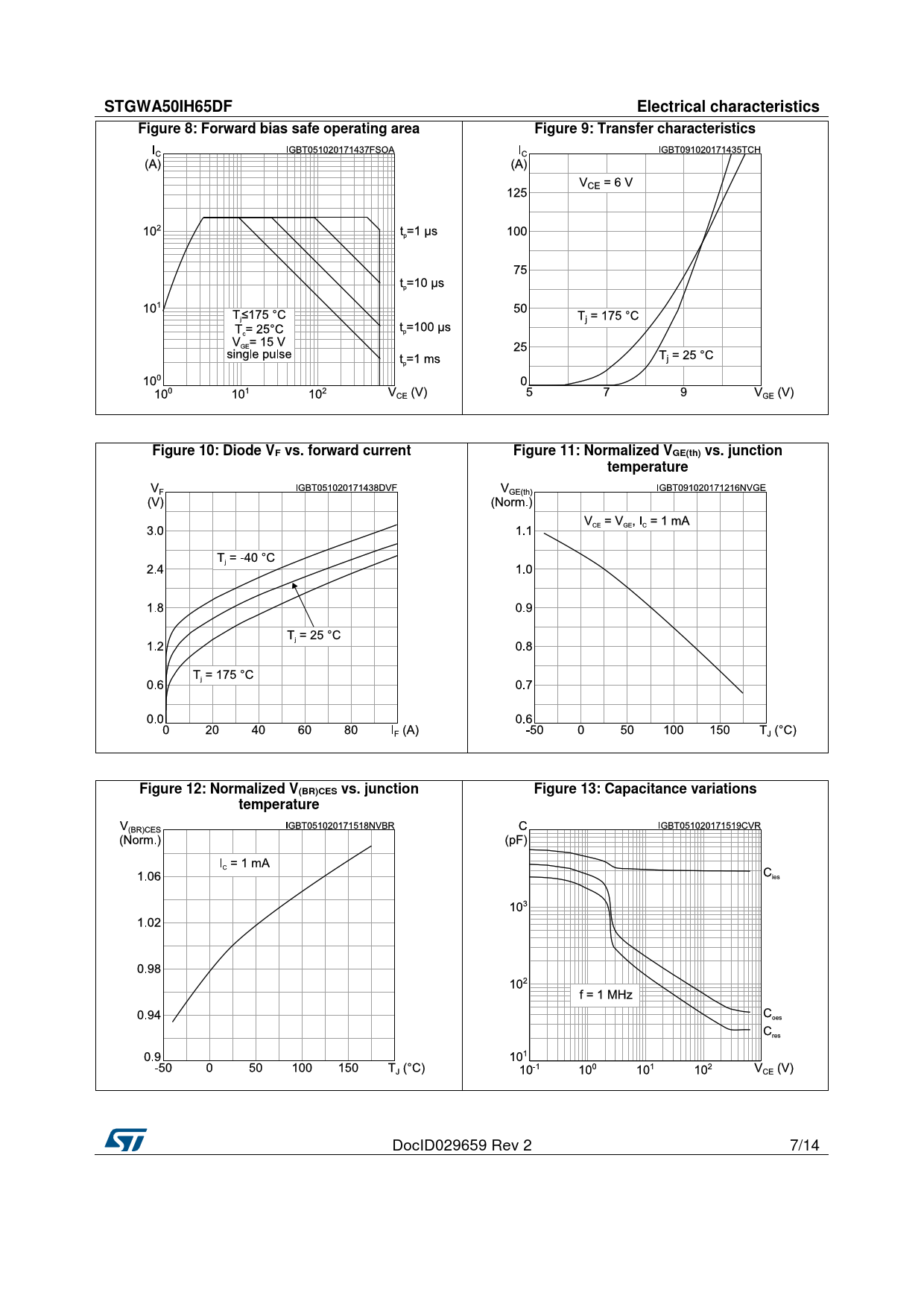 STGWA50IH65DF Electrical characteristics Figure 8: Forward bias safe operating area Figure 9: Transfer characteristics Figure 10: Diode VF vs. forward current Figure 11: Normalized VGE(th) vs. junction temperature Figure 12: Normalized V(BR)CES vs. junction Figure 13: Capacitance variations temperature