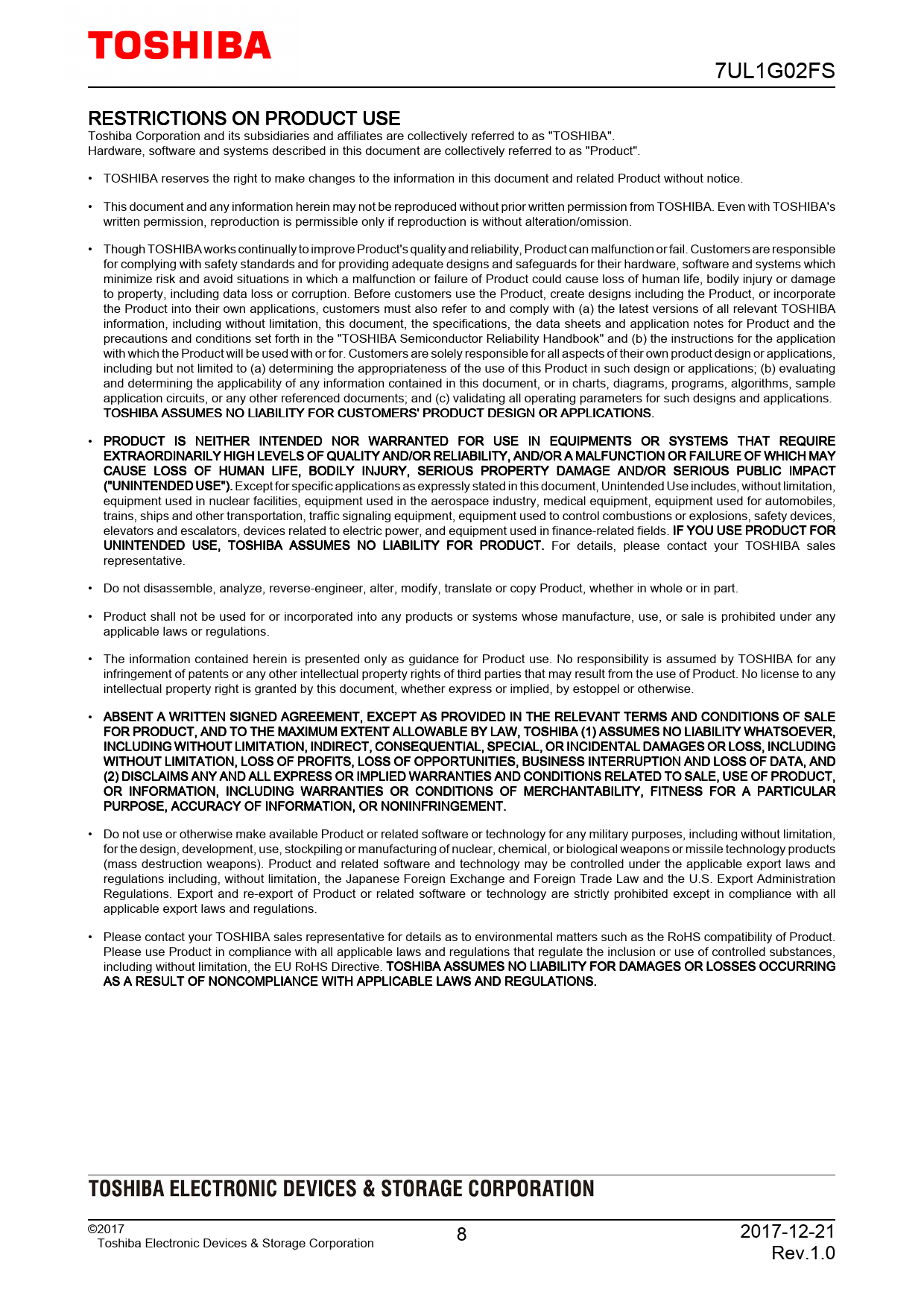 7UL1G02FS. RESTRICTIONS. ON. PRODUCT. USE. Toshiba. Corporation. and. its. subsidiaries. and. affiliates. are. collectively. referred. to. as