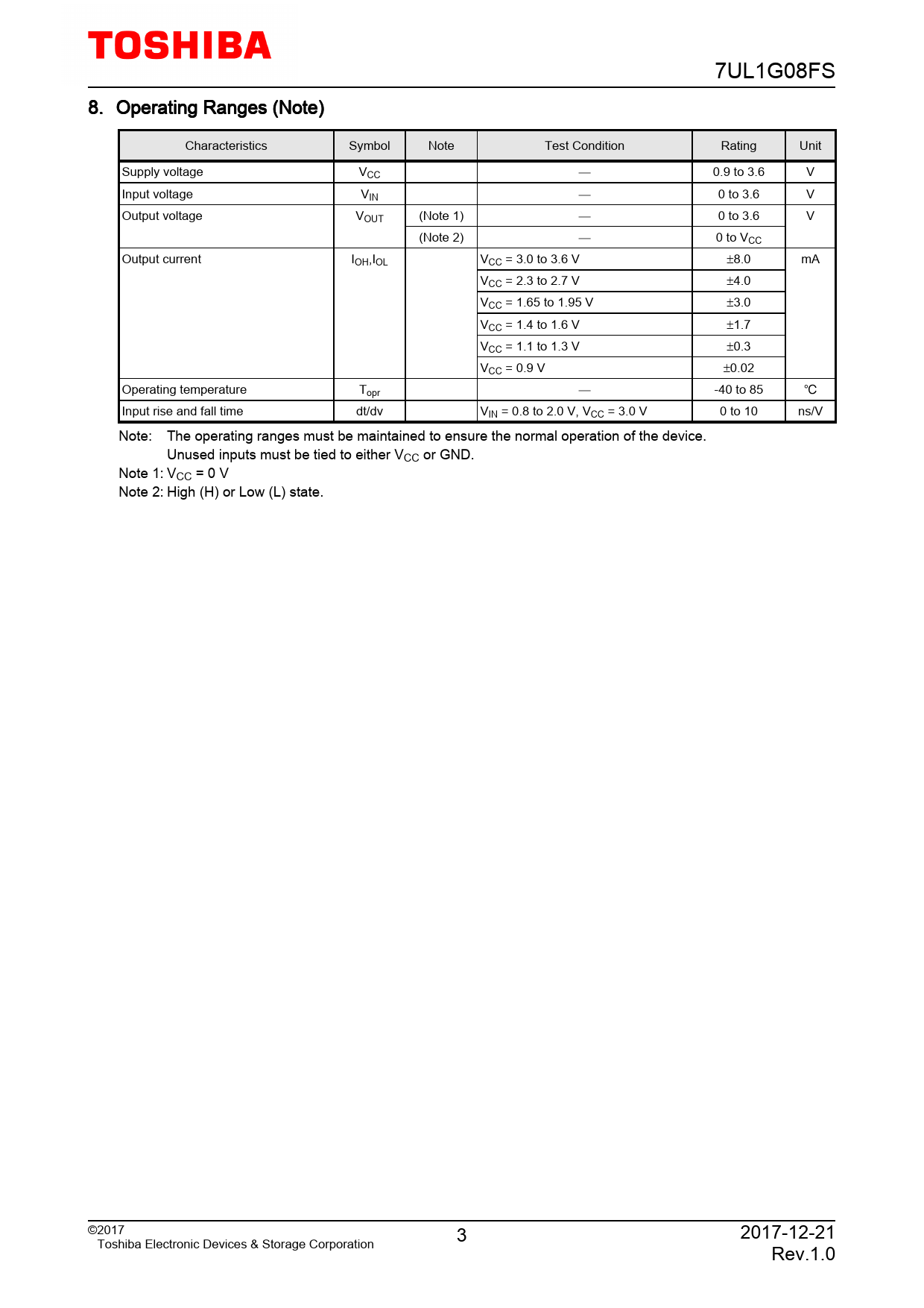 7UL1G08FS 8. Operating Ranges (Note) Characteristics Symbol Note Test Condition Rating Unit Supply voltage VCC 0.9 to 3.6 V Input voltage VIN 0 to 3.6 V Output voltage VOUT (Note 1) 0 to 3.6 V (Note 2) 0 to VCC Output current IOH,IOL VCC = 3.0 to 3.6 V ±8.0 mA VCC = 2.3 to 2.7 V ±4.0 VCC = 1.65 to 1.95 V ±3.0 VCC = 1.4 to 1.6 V ±1.7 VCC = 1.1 to 1.3 V ±0.3 VCC = 0.9 V ±0.02 Operating temperature Topr -40 to 85 Input rise and fall time dt/dv VIN = 0.8 to 2.0 V, VCC = 3.0 V 0 to 10 ns/V Note: The operating ranges must be maintained to ensure the normal operation of the device. Unused inputs must be tied to either VCC or GND. Note 1: VCC = 0 V Note 2: High (H) or Low (L) state. ©2017 3 2017-12-21 Toshiba Electronic Devices & Storage Corporation Rev.1.0