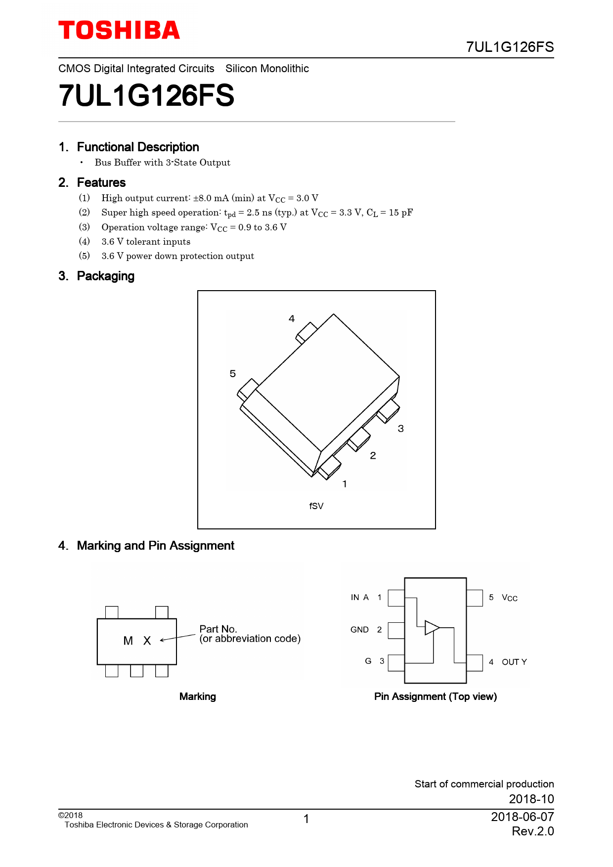 7UL1G126FS CMOS Digital Integrated Circuits Silicon Monolithic 7UL1G126FS 1. Functional Description • Bus Buffer with 3-State Output 2. Features (1) High output current: ±8.0 mA (min) at VCC = 3.0 V (2) Super high speed operation: tpd = 2.5 ns (typ.) at VCC = 3.3 V, CL = 15 pF (3) Operation voltage range: VCC = 0.9 to 3.6 V (4) 3.6 V tolerant inputs (5) 3.6 V power down protection output 3. Packaging fSV 4. Marking and Pin Assignment Marking Pin Assignment (Top view) Start of commercial production 2018-10 ©2018 1 2018-06-07 Toshiba Electronic Devices & Storage Corporation Rev.2.0
