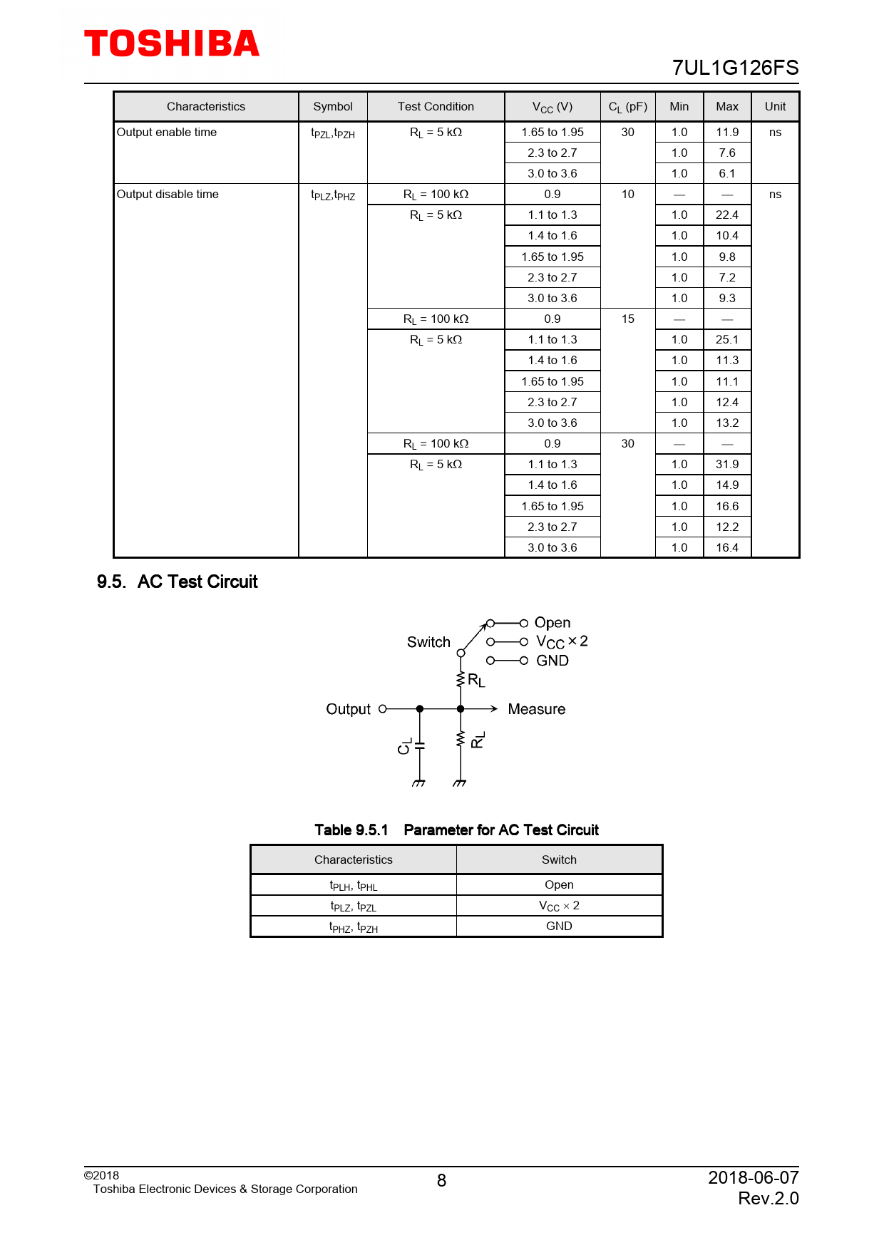 7UL1G126FS Characteristics Symbol Test Condition VCC (V) CL (pF) Min Max Unit Output enable time tPZL,tPZH RL = 5 kΩ 1.65 to 1.95 30 1.0 11.9 ns 2.3 to 2.7 1.0 7.6 3.0 to 3.6 1.0 6.1 Output disable time tPLZ,tPHZ RL = 100 kΩ 0.9 10 ns RL = 5 kΩ 1.1 to 1.3 1.0 22.4 1.4 to 1.6 1.0 10.4 1.65 to 1.95 1.0 9.8 2.3 to 2.7 1.0 7.2 3.0 to 3.6 1.0 9.3 RL = 100 kΩ 0.9 15 RL = 5 kΩ 1.1 to 1.3 1.0 25.1 1.4 to 1.6 1.0 11.3 1.65 to 1.95 1.0 11.1 2.3 to 2.7 1.0 12.4 3.0 to 3.6 1.0 13.2 RL = 100 kΩ 0.9 30 RL = 5 kΩ 1.1 to 1.3 1.0 31.9 1.4 to 1.6 1.0 14.9 1.65 to 1.95 1.0 16.6 2.3 to 2.7 1.0 12.2 3.0 to 3.6 1.0 16.4 9.5. AC Test Circuit Table 9.5.1 Parameter for AC Test Circuit Characteristics Switch tPLH, tPHL Open tPLZ, tPZL VCC × 2 tPHZ, tPZH GND ©2018 8 2018-06-07 Toshiba Electronic Devices & Storage Corporation Rev.2.0
