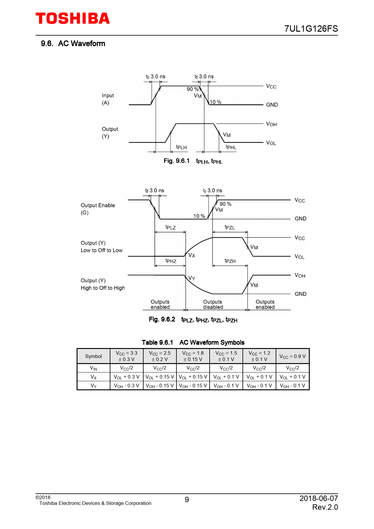 7UL1G126FS 9.6. AC Waveform Fig. 9.6.1 tPLH, tPHL Fig. 9.6.2 tPLZ, tPHZ, tPZL, tPZH Table 9.6.1 AC Waveform Symbols VCC = 3.3 VCC = 2.5 VCC = 1.8 VCC = 1.5 VCC = 1.2 Symbol VCC = 0.9 V ± 0.3 V ± 0.2 V ± 0.15 V ± 0.1 V ± 0.1 V VIN VCC/2 VCC/2 VCC/2 VCC/2 VCC/2 VCC/2 VX VOL + 0.3 V VOL + 0.15 V VOL + 0.15 V VOL + 0.1 V VOL + 0.1 V VOL + 0.1 V VY VOH - 0.3 V VOH - 0.15 V VOH - 0.15 V VOH - 0.1 V VOH - 0.1 V VOH - 0.1 V ©2018 9 2018-06-07 Toshiba Electronic Devices & Storage Corporation Rev.2.0