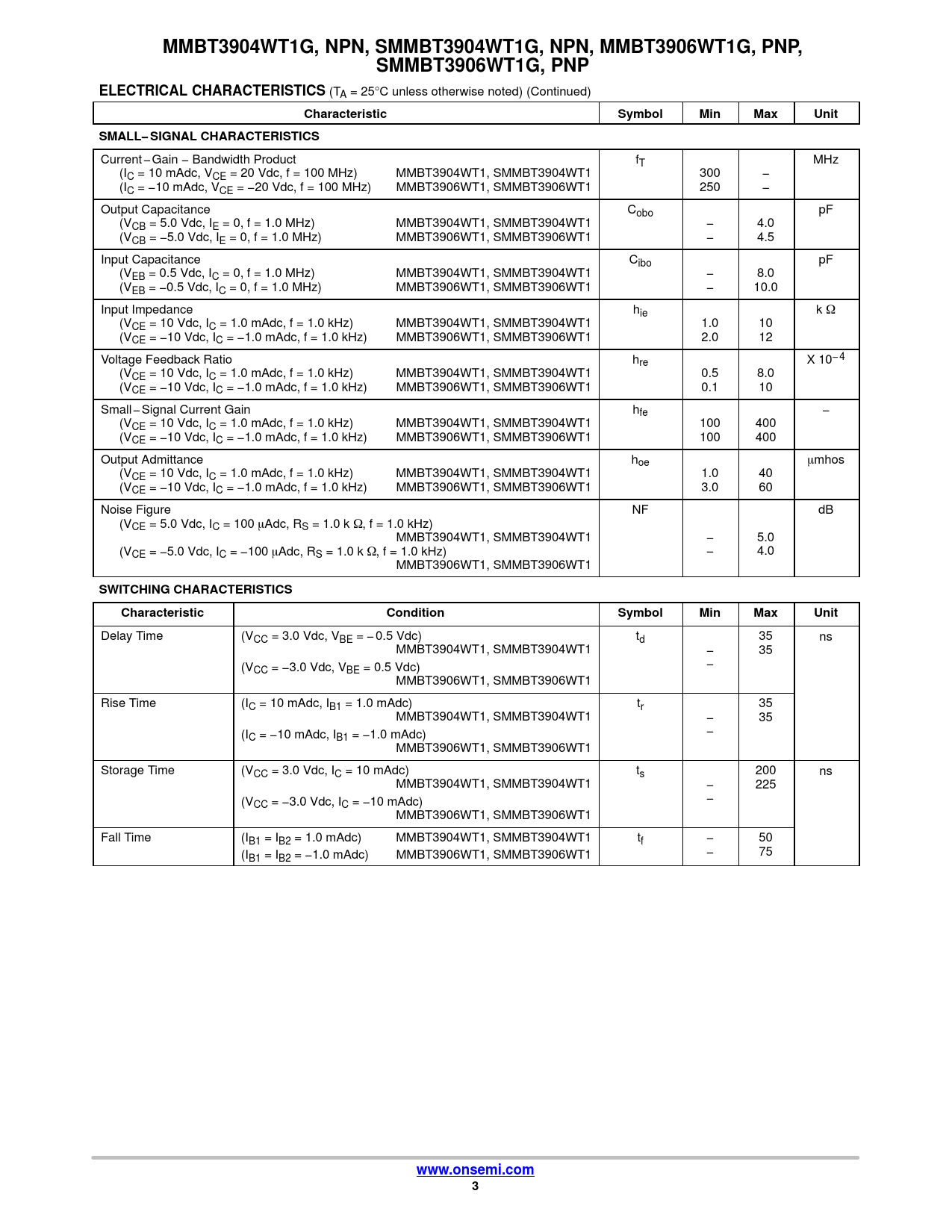 Current − Gain − Bandwidth Product fT MHz (IC = 10 mAdc, VCE = 20 Vdc, f = 100 MHz) MMBT3904WT1, SMMBT3904WT1 300 − (IC = −10 mAdc, VCE = −20 Vdc, f = 100 MHz) MMBT3906WT1, SMMBT3906WT1 250 − Output Capacitance Cobo pF (VCB = 5.0 Vdc, IE = 0, f = 1.0 MHz) MMBT3904WT1, SMMBT3904WT1 − 4.0 (VCB = −5.0 Vdc, IE = 0, f = 1.0 MHz) MMBT3906WT1, SMMBT3906WT1 − 4.5 Input Capacitance Cibo pF (VEB = 0.5 Vdc, IC = 0, f = 1.0 MHz) MMBT3904WT1, SMMBT3904WT1 − 8.0 (VEB = −0.5 Vdc, IC = 0, f = 1.0 MHz) MMBT3906WT1, SMMBT3906WT1 − 10.0 Input Impedance hie k W (VCE = 10 Vdc, IC = 1.0 mAdc, f = 1.0 kHz) MMBT3904WT1, SMMBT3904WT1 1.0 10 (VCE = −10 Vdc, IC = −1.0 mAdc, f = 1.0 kHz) MMBT3906WT1, SMMBT3906WT1 2.0 12 Voltage Feedback Ratio hre X 10− 4 (VCE = 10 Vdc, IC = 1.0 mAdc, f = 1.0 kHz) MMBT3904WT1, SMMBT3904WT1 0.5 8.0 (VCE = −10 Vdc, IC = −1.0 mAdc, f = 1.0 kHz) MMBT3906WT1, SMMBT3906WT1 0.1 10 Small − Signal Current Gain hfe − (VCE = 10 Vdc, IC = 1.0 mAdc, f = 1.0 kHz) MMBT3904WT1, SMMBT3904WT1 100 400 (VCE = −10 Vdc, IC = −1.0 mAdc, f = 1.0 kHz) MMBT3906WT1, SMMBT3906WT1 100 400 Output Admittance hoe mmhos (VCE = 10 Vdc, IC = 1.0 mAdc, f = 1.0 kHz) MMBT3904WT1, SMMBT3904WT1 1.0 40 (VCE = −10 Vdc, IC = −1.0 mAdc, f = 1.0 kHz) MMBT3906WT1, SMMBT3906WT1 3.0 60 Noise Figure NF dB (VCE = 5.0 Vdc, IC = 100 mAdc, RS = 1.0 k W, f = 1.0 kHz) MMBT3904WT1, SMMBT3904WT1 − 5.0 (VCE = −5.0 Vdc, IC = −100 mAdc, RS = 1.0 k W, f = 1.0 kHz) − 4.0 MMBT3906WT1, SMMBT3906WT1