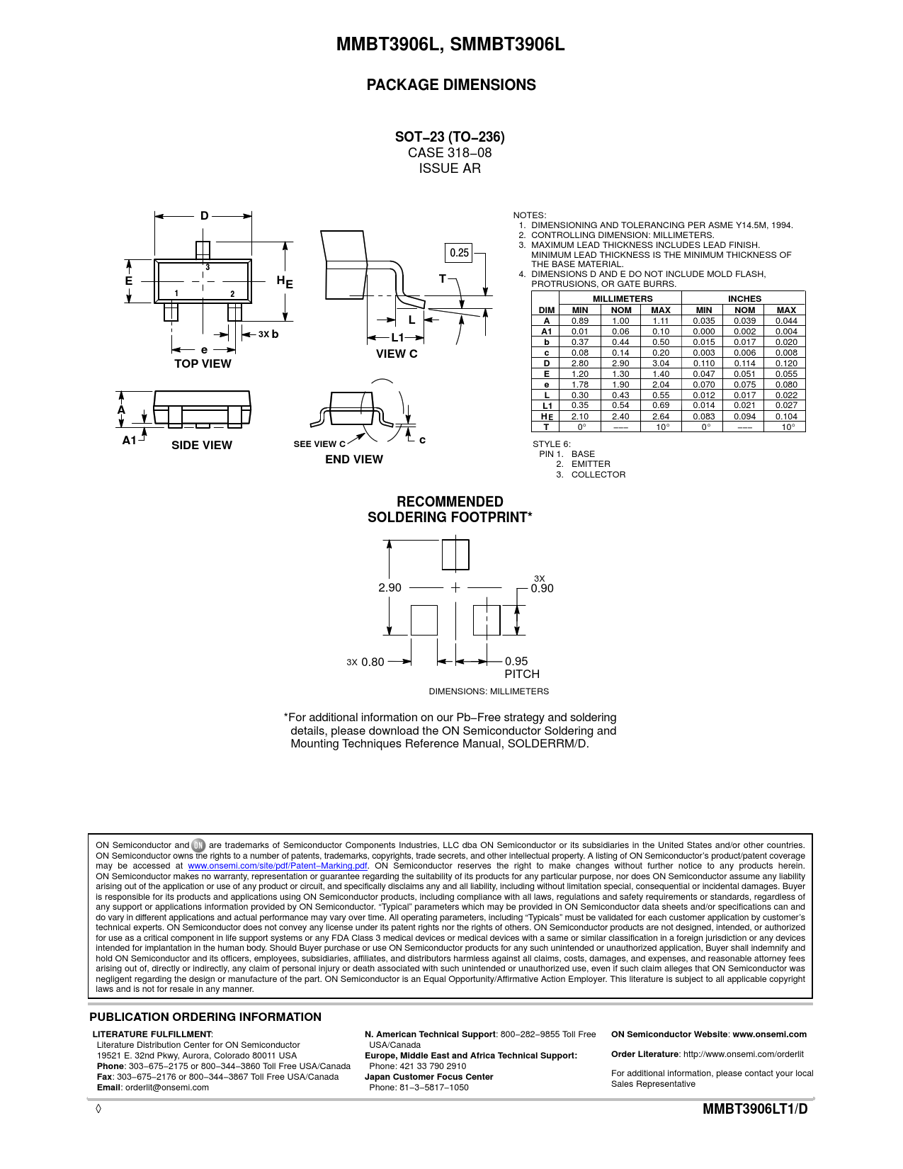 MMBT3906L, SMMBT3906LPACKAGE DIMENSIONSSOT−23 (TO−236) CASE 318−08 ISSUE AR D NOTES: 1. DIMENSIONING AND TOLERANCING PER ASME Y14.5M, 1994. 2. CONTROLLING DIMENSION: MILLIMETERS. 3. MAXIMUM LEAD THICKNESS INCLUDES LEAD FINISH. 0.25 MINIMUM LEAD THICKNESS IS THE MINIMUM THICKNESS OF 3 THE BASE MATERIAL. 4. DIMENSIONS D AND E DO NOT INCLUDE MOLD FLASH, EHTE PROTRUSIONS, OR GATE BURRS. 12MILLIMETERSINCHESDIMMINNOMMAXMINNOMMAXLA 0.89 1.00 1.11 0.035 0.039 0.044 3X bA1 0.01 0.06 0.10 0.000 0.002 0.004 L1b 0.37 0.44 0.50 0.015 0.017 0.020 eVIEW Cc 0.08 0.14 0.20 0.003 0.006 0.008 TOP VIEWD 2.80 2.90 3.04 0.110 0.114 0.120 E 1.20 1.30 1.40 0.047 0.051 0.055 e 1.78 1.90 2.04 0.070 0.075 0.080 L 0.30 0.43 0.55 0.012 0.017 0.022 AL1 0.35 0.54 0.69 0.014 0.021 0.027 H E 2.10 2.40 2.64 0.083 0.094 0.104 T 0° −−− 10° 0° −−− 10° A1cSEE VIEW CSIDE VIEW STYLE 6: PIN 1. BASE END VIEW 2. EMITTER 3. COLLECTOR RECOMMENDEDSOLDERING FOOTPRINT* 3X 2.90 0.90 3X 0.80 0.95 PITCH DIMENSIONS: MILLIMETERS *For additional information on our Pb−Free strategy and soldering details, please download the ON Semiconductor Soldering and Mounting Techniques Reference Manual, SOLDERRM/D. ON Semiconductor and are trademarks of Semiconductor Components Industries, LLC dba ON Semiconductor or its subsidiaries in the United States and/or other countries. ON Semiconductor owns the rights to a number of patents, trademarks, copyrights, trade secrets, and other intellectual property. A listing of ON Semiconductor’s product/patent coverage may be accessed at www.onsemi.com/site/pdf/Patent−Marking.pdf. ON Semiconductor reserves the right to make changes without further notice to any products herein. ON Semiconductor makes no warranty, representation or guarantee regarding the suitability of its products for any particular purpose, nor does ON Semiconductor assume any liability arising out of the application or use of any product or circuit, and specifically disclaims any and all liability, including without limitation special, consequential or incidental damages. Buyer is responsible for its products and applications using ON Semiconductor products, including compliance with all laws, regulations and safety requirements or standards, regardless of any support or applications information provided by ON Semiconductor. “Typical” parameters which may be provided in ON Semiconductor data sheets and/or specifications can and do vary in different applications and actual performance may vary over time. All operating parameters, including “Typicals” must be validated for each customer application by customer’s technical experts. ON Semiconductor does not convey any license under its patent rights nor the rights of others. ON Semiconductor products are not designed, intended, or authorized for use as a critical component in life support systems or any FDA Class 3 medical devices or medical devices with a same or similar classification in a foreign jurisdiction or any devices intended for implantation in the human body. Should Buyer purchase or use ON Semiconductor products for any such unintended or unauthorized application, Buyer shall indemnify and hold ON Semiconductor and its officers, employees, subsidiaries, affiliates, and distributors harmless against all claims, costs, damages, and expenses, and reasonable attorney fees arising out of, directly or indirectly, any claim of personal injury or death associated with such unintended or unauthorized use, even if such claim alleges that ON Semiconductor was negligent regarding the design or manufacture of the part. ON Semiconductor is an Equal Opportunity/Affirmative Action Employer. This literature is subject to all applicable copyright laws and is not for resale in any manner. PUBLICATION ORDERING INFORMATIONLITERATURE FULFILLMENT : N. American Technical Support : 800−282−9855 Toll Free ON Semiconductor Website : www.onsemi.com Literature Distribution Center for ON Semiconductor USA/Canada 19521 E. 32nd Pkwy, Aurora, Colorado 80011 USA Europe, Middle East and Africa Technical Support:Order Literature : http://www.onsemi.com/orderlit Phone : 303−675−2175 or 800−344−3860 Toll Free USA/Canada Phone: 421 33 790 2910 Fax : 303−675−2176 or 800−344−3867 Toll Free USA/Canada Japan Customer Focus Center For additional information, please contact your local Email : orderlit@onsemi.com Phone: 81−3−5817−1050 Sales Representative ◊ www.onsemi.comMMBT3906LT1/D7
