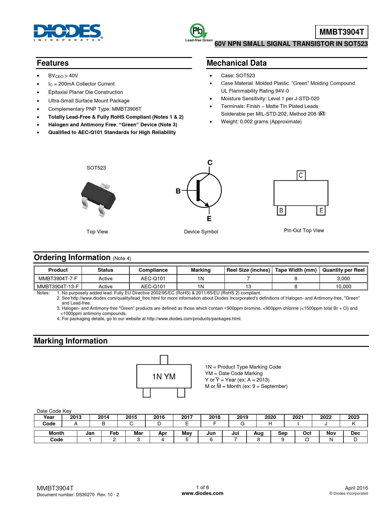 MMBT3904T-7-F Active AEC-Q101 1N 7 8 3,000 MMBT3904T-13-F Active AEC-Q101 1N 13 8 10,000 Notes: 1. No purposely added lead. Fully EU Directive 2002/95/EC (RoHS) & 2011/65/EU (RoHS 2) compliant. 2. See http://www.diodes.com/quality/lead_free.html for more information about Diodes Incorporated’s definitions of Halogen- and Antimony-free, "Green" and Lead-free. 3. Halogen- and Antimony-free "Green” products are defined as those which contain <900ppm bromine, <900ppm chlorine (<1500ppm total Br + Cl) and <1000ppm antimony compounds. 4. For packaging details, go to our website at http://www.diodes.com/products/packages.html.