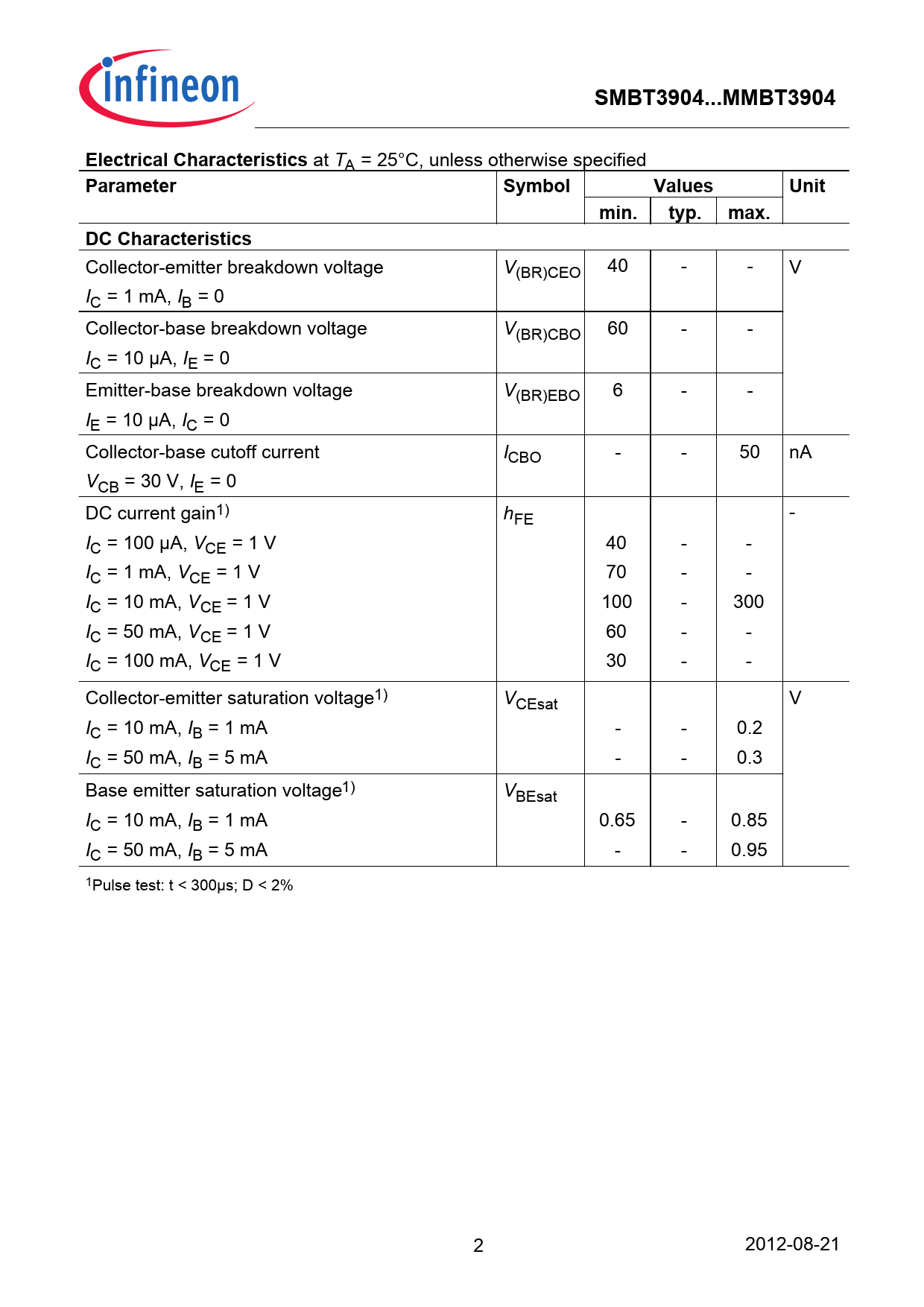 SMBT3904...MMBT3904. Electrical Characteristics. Parameter. Symbol. Values. Unit. min. typ. max. DC Characteristics