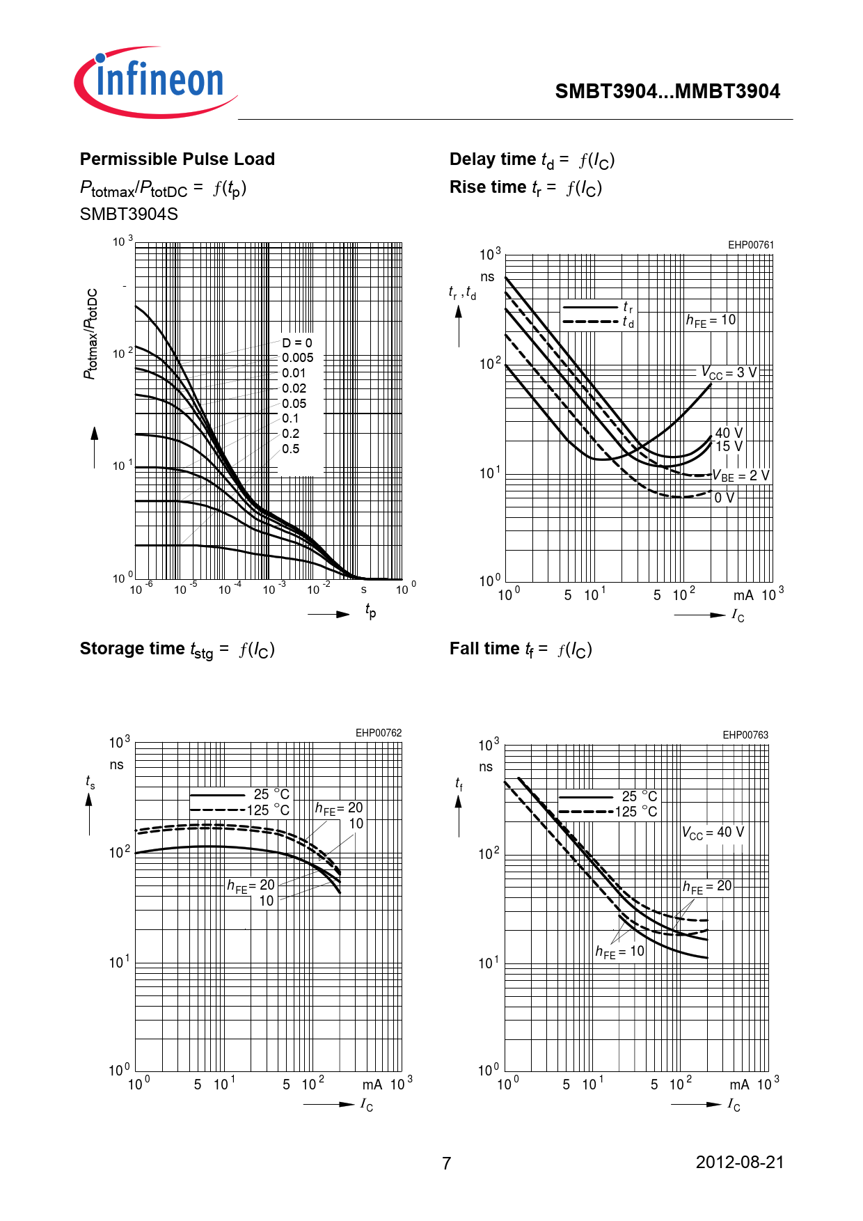 tr = ƒ(IC) SMBT3904S 3 10 EHP00761 10 3 ns - t ,t r d t totDC r /P t h = 10 d FE D = 0 2 10 0.005 totmax 10 2 P 0.01 VCC = 3 V 0.02 0.05 0.1 0.2 40 V 0.5 15 V 1 10 10 1 V BE = 2 V 0 V 0 10 10 0 10 -6 10 -5 10 -4 10 -3 10 -2 10 0 s 10 0 5 10 1 5 10 2 mA 3 10 tp Ι C