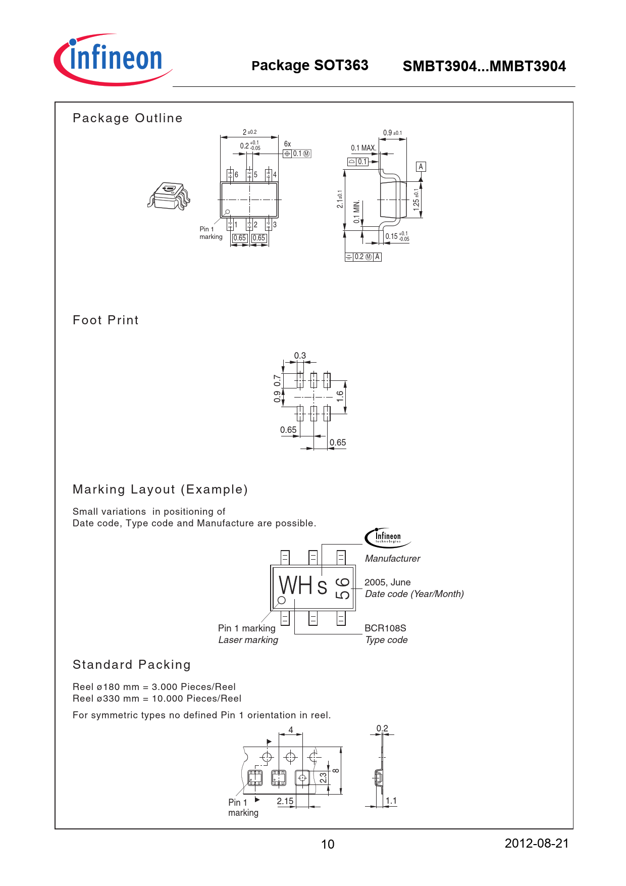 Package SOT363SMBT3904...MMBT3904 P a c k a g e O u t l i n e 2 ±0.2 0.9 ±0.1 +0.1 0.2 6x -0.05 0.1 MAX. 0.1 M 0.1 A 6 5 4 ±0.1 ±0.1 2.1 1.25 0.1 MIN. 1 2 3 Pin 1 +0.1 marking 0.15 0.65 0.65 -0.05 0.2 M A F o o t P r i n t 0.3 0.7 0.9 1.6 0.65 0.65 M a r k i n g L a y o u t ( E x a m p l e ) Small variations in positioning of Date code, Type code and Manufacture are possible. Manufacturer 2005, June Date code (Year/Month) Pin 1 marking BCR108S Laser marking Type code S t a n d a r d P a c k i n g Reel ø180 mm = 3.000 Pieces/Reel Reel ø330 mm = 10.000 Pieces/Reel For symmetric types no defined Pin 1 orientation in reel. 4 0.2 8 2.3 Pin 1 2.15 1.1 marking 10 2012-08-21