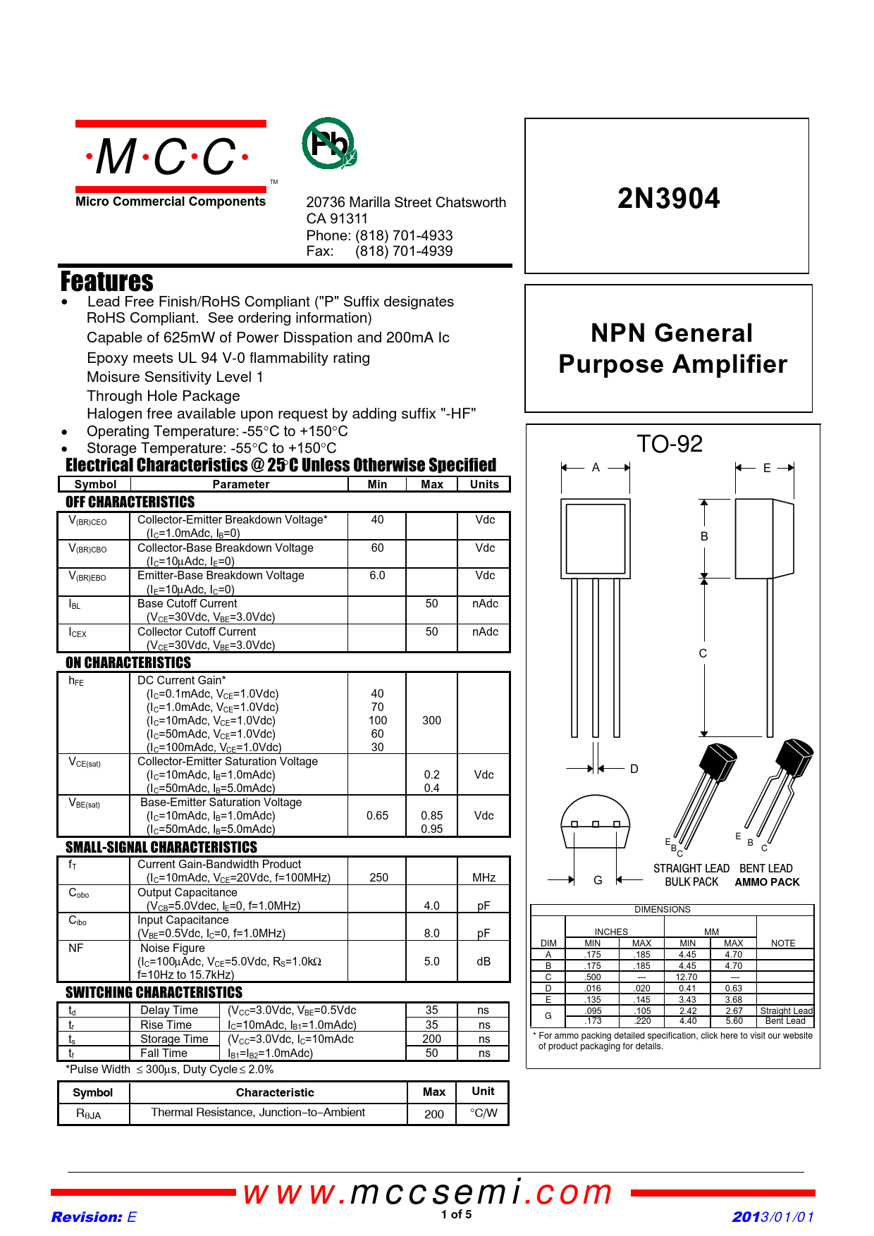 Micro Commercial Components. 2N3904. NPN General. Purpose Amplifier. Symbol. Parameter. Min. Max. Units. AMMO PACK. Characteristic. Unit