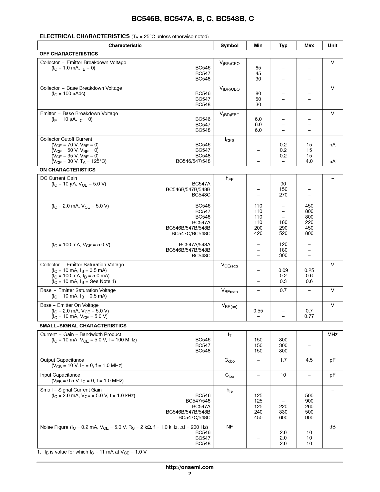 BC546B, BC547A, B, C, BC548B, C. ELECTRICAL CHARACTERISTICS. Characteristic. Symbol. Min. Typ. Max. Unit. OFF CHARACTERISTICS