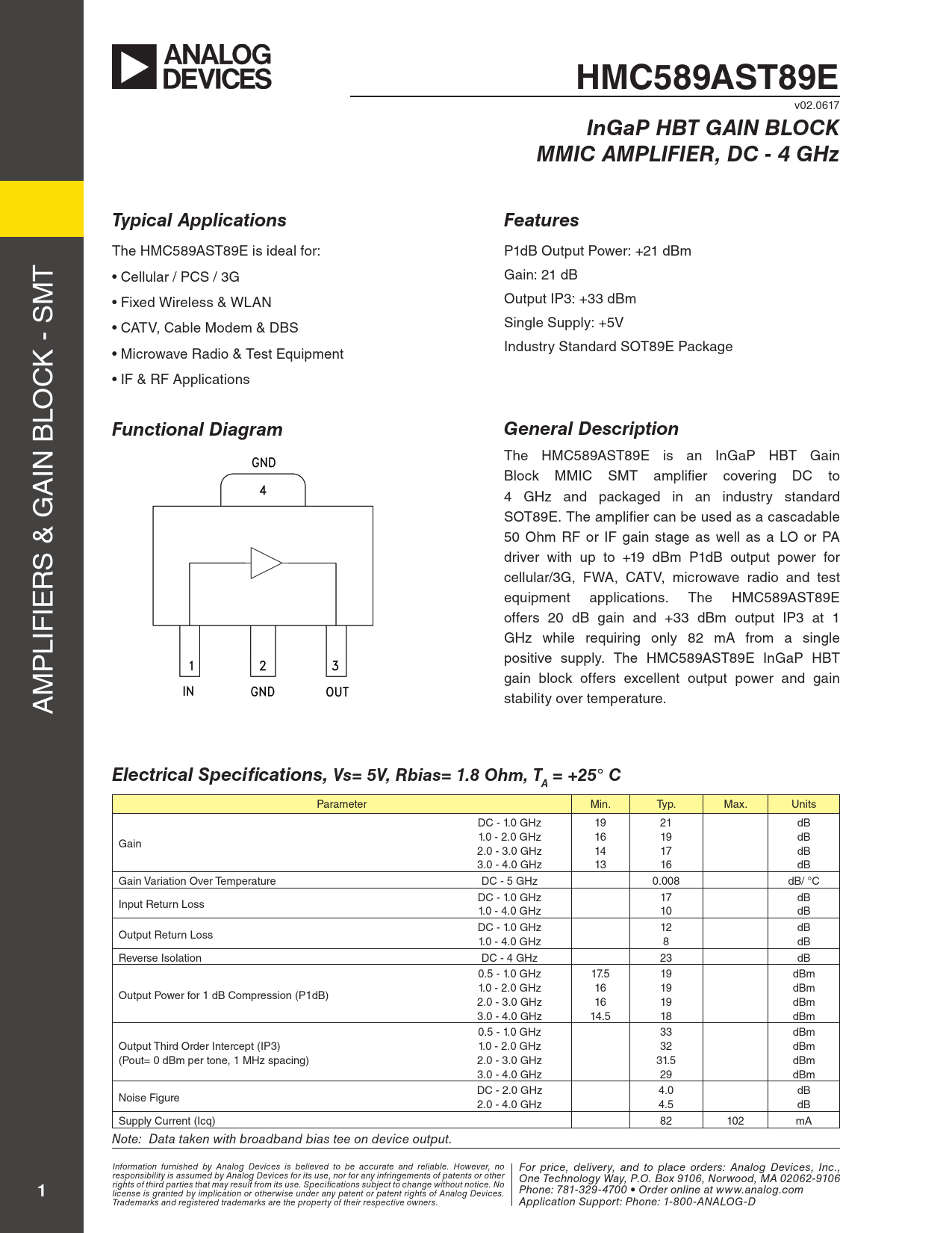 IN B The HMC589AST89E is an InGaP HBT Gain A Block MMIC SMT amplifier covering DC to 4 GHz and packaged in an industry standard SOT89E. The amplifier can be used as a cascadable 50 Ohm RF or IF gain stage as well as a LO or PA S & G driver with up to +19 dBm P1dB output power for R cel ular/3G, FWA, CATV, microwave radio and test IE equipment applications. The HMC589AST89E offers 20 dB gain and +33 dBm output IP3 at 1 LIF GHz while requiring only 82 mA from a single P positive supply. The HMC589AST89E InGaP HBT M gain block offers excel ent output power and gain A stability over temperature.