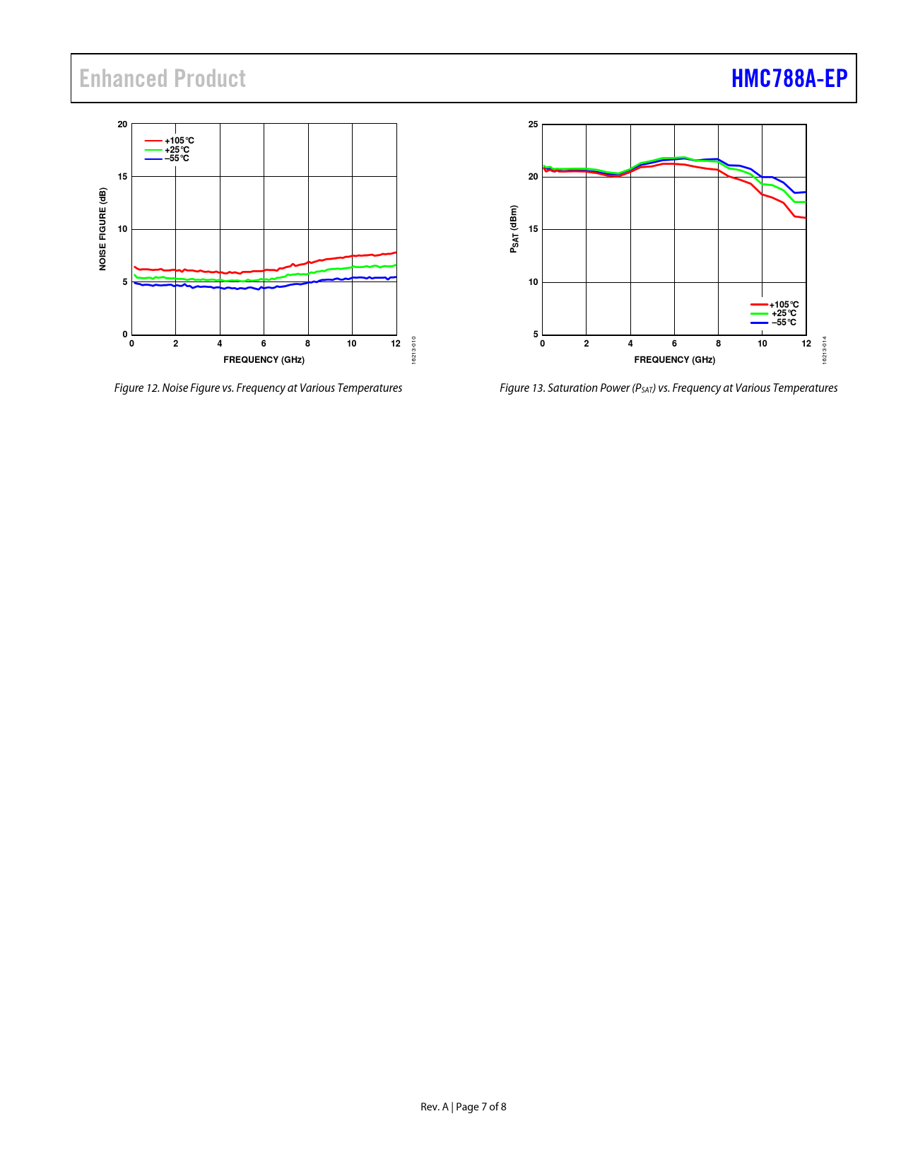 Enhanced ProductHMC788A-EP2025+105°C +25°C –55°C1520) dB ( E RBm) d10(15FIGUATESPOIS N510+105°C+25°C –55°C05024681012 010 024681012 014 FREQUENCY (GHz) 16213- FREQUENCY (GHz) 16213- Figure 12. Noise Figure vs. Frequency at Various Temperatures Figure 13. Saturation Power (PSAT) vs. Frequency at Various Temperatures Rev. A | Page 7 of 8 Document Outline Features Enhanced Product Features Applications Functional Block Diagram General Description Revision History Specifications Electrical Specifications Absolute Maximum Ratings Thermal Resistance Power Derating Curves ESD Caution Pin Configuration and Function Descriptions Interface Schematics Typical Performance Characteristics Outline Dimensions Ordering Guide