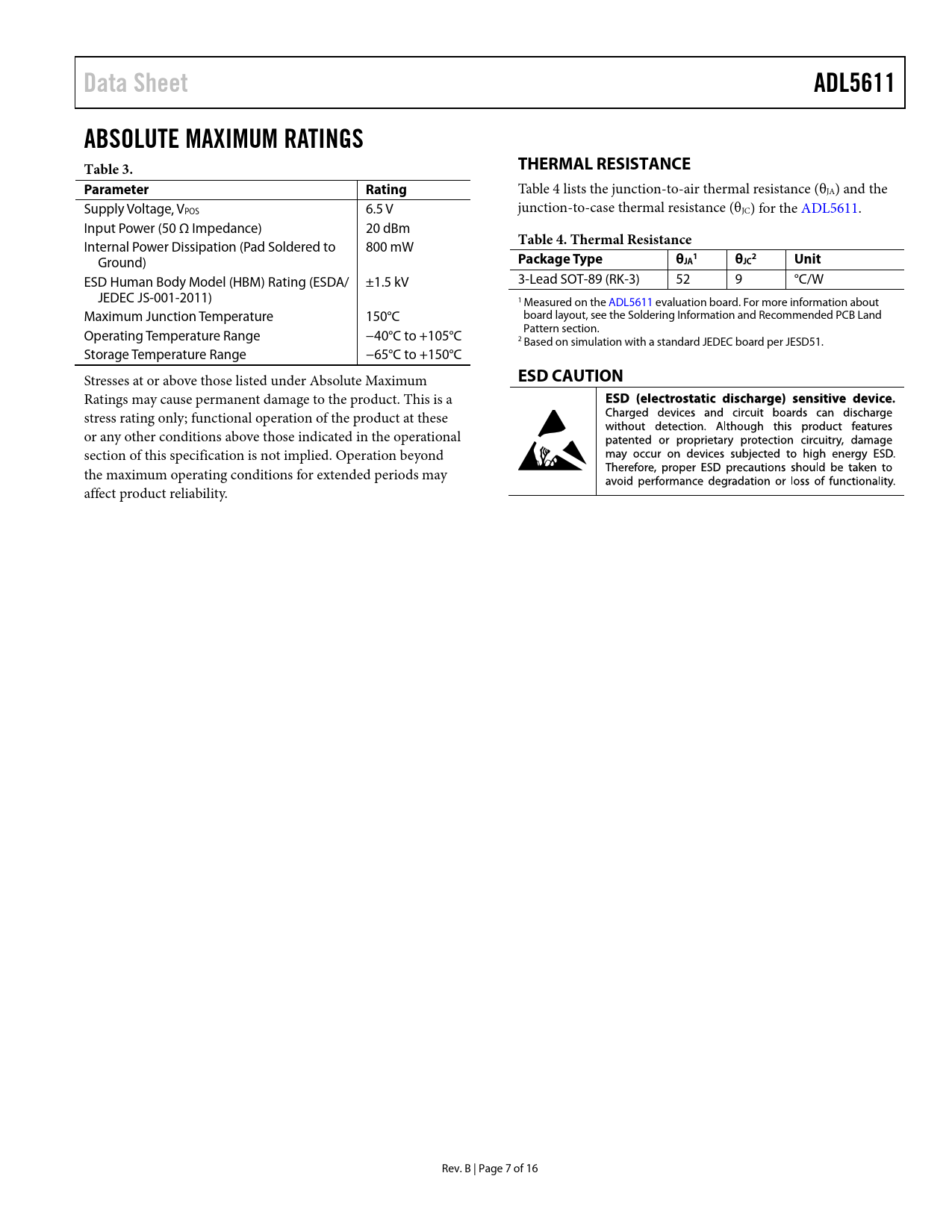 页数 / 页16 / 7 — Data Sheet. ADL5611. ABSOLUTE MAXIMUM RATINGS Table 3. THERMAL …