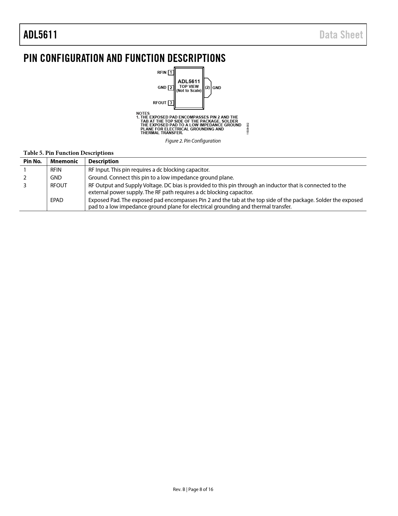 ADL5611 Data Sheet PIN CONFIGURATION AND FUNCTION DESCRIPTIONS RFIN 1 ADL5611 GND 2 TOP VIEW (2) GND (Not to Scale) RFOUT 3 NOTES 1. THE EXPOSED PAD ENCOMPASSES PIN 2 AND THE TAB AT THE TOP SIDE OF THE PACKAGE. SOLDER THE EXPOSED PAD TO A LOW IMPEDANCE GROUND