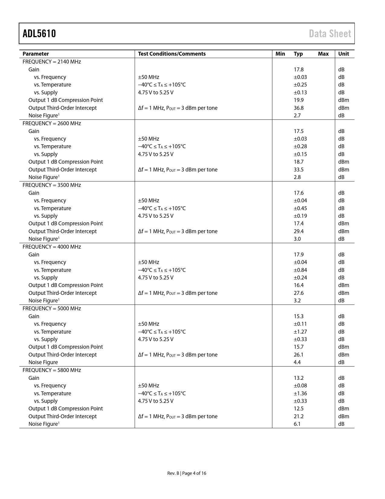 页数 / 页16 / 4 — ADL5610. Data Sheet. Parameter. Test Conditions/Comments. Min. Typ. Max. …