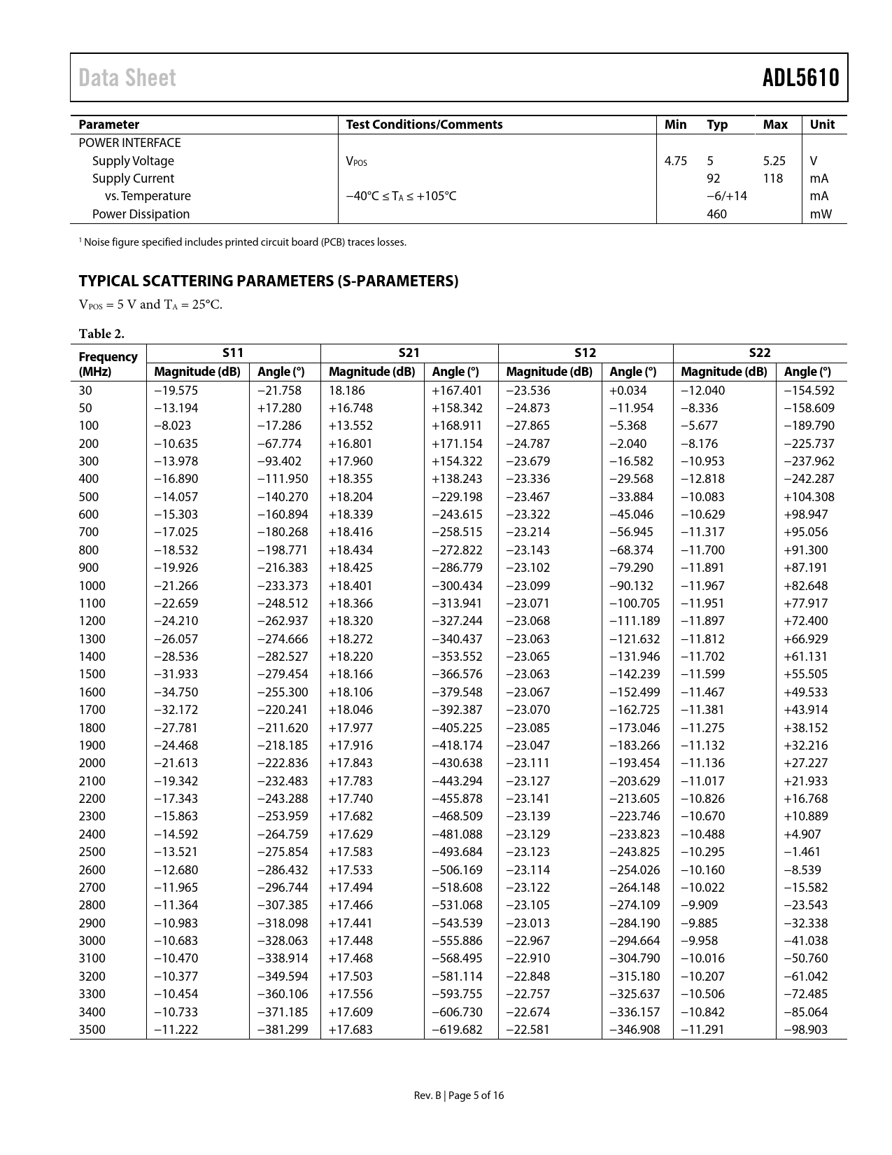 | 页数 / 页 | 16 / 5 — Data Sheet. ADL5610. Parameter. Test Conditions/Comments. Min. Typ. Max. … |