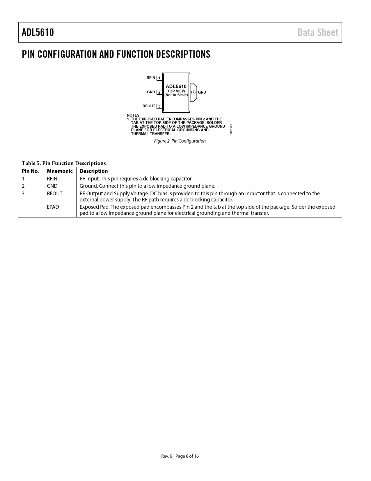 ADL5610Data SheetPIN CONFIGURATION AND FUNCTION DESCRIPTIONSRFIN 1ADL5610GND 2TOP VIEW(2) GND(Not to Scale)RFOUT 3NOTES1. THE EXPOSED PAD ENCOMPASSES PIN 2 AND THETAB AT THE TOP SIDE OF THE PACKAGE. SOLDERTHE EXPOSED PAD TO A LOW IMPEDANCE GROUND 002 PLANE FOR ELECTRICAL GROUNDING ANDTHERMAL TRANSFER. 11507- Figure 2. Pin Configuration Table 5. Pin Function Descriptions Pin No.Mnemonic Description 1 RFIN RF Input. This pin requires a dc blocking capacitor. 2 GND Ground. Connect this pin to a low impedance ground plane. 3 RFOUT RF Output and Supply Voltage. DC bias is provided to this pin through an inductor that is connected to the external power supply. The RF path requires a dc blocking capacitor. EPAD Exposed Pad. The exposed pad encompasses Pin 2 and the tab at the top side of the package. Solder the exposed pad to a low impedance ground plane for electrical grounding and thermal transfer. Rev. B | Page 8 of 16 Document Outline Features Functional Block Diagram General Description Table of Contents Revision History Specifications Typical Scattering Parameters (S-Parameters) Absolute Maximum Ratings Thermal Resistance ESD Caution Pin Configuration and Function Descriptions Typical Performance Characteristics 500 MHz to 6 GHz Frequency Band 30 MHz to 500 MHz Frequency Band General Applications Information Basic Connections Soldering Information and Recommended PCB Land Pattern W-CDMA ACPR Performance Evaluation Board Outline Dimensions Ordering Guide