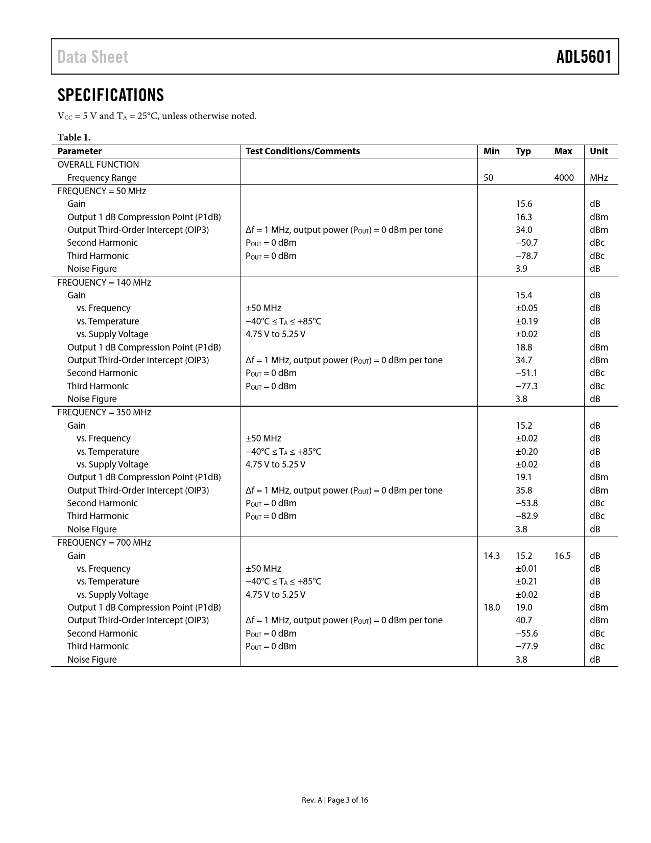 页数 / 页16 / 3 — Data Sheet. ADL5601. SPECIFICATIONS. Table 1. Parameter. Test …