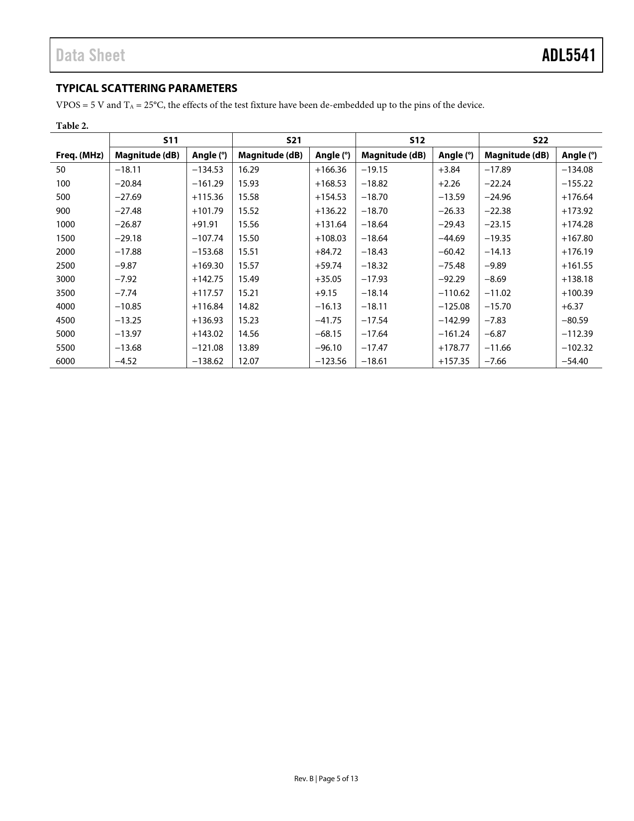 | 页数 / 页 | 13 / 5 — Data Sheet. ADL5541. TYPICAL SCATTERING PARAMETERS. Table 2. S11. S21. … |