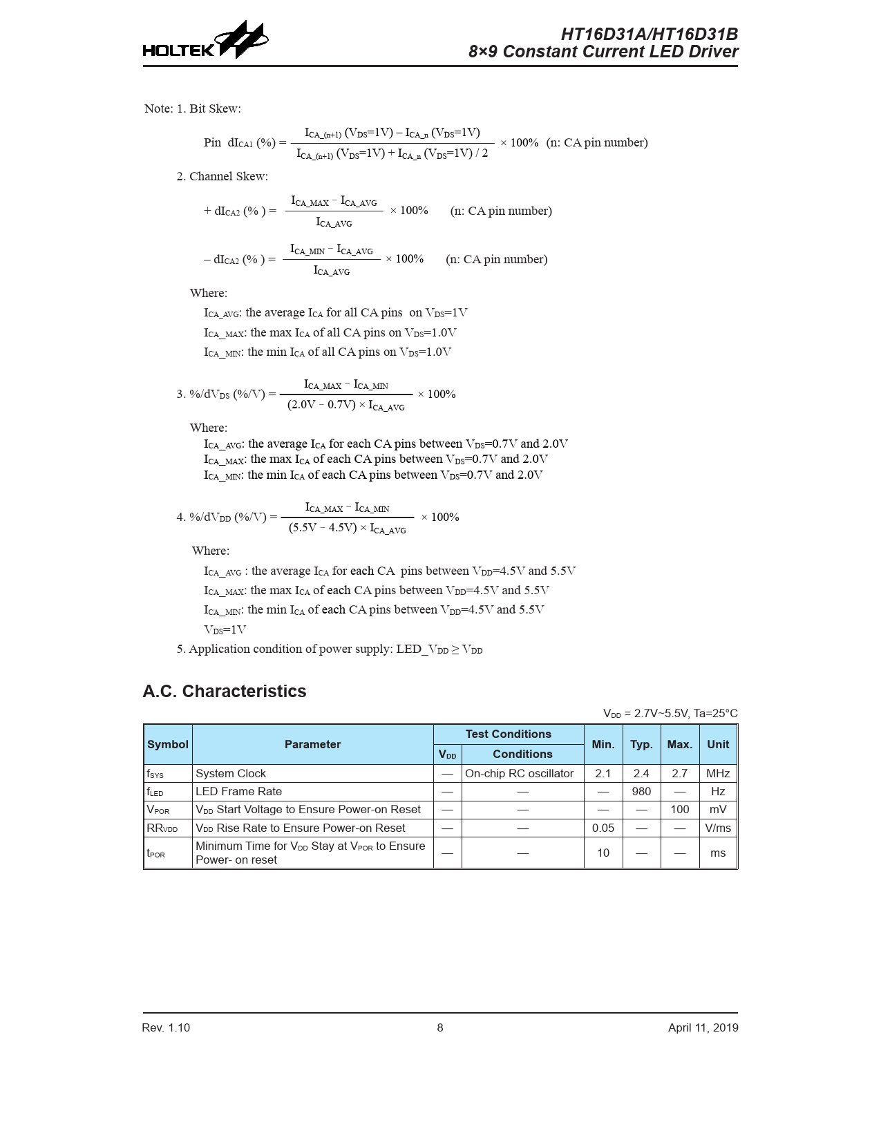 HT16D31A/HT16D31BHT16D31A/HT16D31B8×9 Constant Current LED Driver8×9 Constant Current LED Driver Note: 1. Bit Skew: I Pin dI CA_(n+1) (VDS=1V) – ICA_n (VDS=1V) CA1 (%) = × 100% (n: CA pin number) ICA_(n+1) (VDS=1V) + ICA_n (VDS=1V) / 2 2. Channel Skew: I + dI CA_MAX–ICA_AVG CA2 (% ) = × 100% (n: CA pin number) ICA_AVG I – dI CA_MIN–ICA_AVG CA2 (% ) = × 100% (n: CA pin number) ICA_AVG Where: ICA_AVG: the average ICA for all CA pins on VDS=1V ICA_MAX: the max ICA of all CA pins on VDS=1.0V ICA_MIN: the min ICA of all CA pins on VDS=1.0V I 3. %/dV CA_MAX–ICA_MIN DS (%/V) = × 100% (2.0V–0.7V) × ICA_AVG Where: ICA_AVG: the average ICA for each CA pins between VDS=0.7V and 2.0V ICA_MAX: the max ICA of each CA pins between VDS=0.7V and 2.0V ICA_MIN: the min ICA of each CA pins between VDS=0.7V and 2.0V I 4. %/dV CA_MAX–ICA_MIN DD (%/V) = × 100% (5.5V–4.5V) × ICA_AVG Where: ICA_AVG : the average ICA for each CA pins between VDD=4.5V and 5.5V ICA_MAX: the max ICA of each CA pins between VDD=4.5V and 5.5V ICA_MIN: the min ICA of each CA pins between VDD=4.5V and 5.5V VDS=1V 5. Application condition of power supply: LED_VDD ≥ VDD A.C. Characteristics VDD = 2.7V~5.5V, Ta=25°C Test ConditionsSymbolParameterMin. Typ. Max. UnitVDDConditions fSYS System Clock — On-chip RC oscillator 2.1 2.4 2.7 MHz fLED LED Frame Rate — — — 980 — Hz VPOR VDD Start Voltage to Ensure Power-on Reset — — — — 100 mV RRVDD VDD Rise Rate to Ensure Power-on Reset — — 0.05 — — V/ms t Minimum Time for VDD Stay at VPOR to Ensure POR Power- on reset — — 10 — — ms Rev. 1.10 8 April 11, 2019 Rev. 1.10 9 April 11, 2019 Document Outline Features Applications General Description Selection Table Block Diagram Pin Assignment Pin Description Approximate Internal Connections Absolute Maximum Ratings D.C. Characteristics A.C. Characteristics A.C. Characteristics – SPI 3-wire Serial Bus A.C. Characteristics – IC Serial Bus Timing Diagrams SPI 3-Wire Serial Bus Timing I2C Bus Timing Power on Reset Timing Functional Description Power-on Reset LED Driver System Oscillator Driver Outputs Address Pointer Open/Short Detection Function Over Temperature Protection Constant Current Output Load Supply Voltage – LED_V Display Data RAM – DDRAM Fade Data RAM LED On/Off Control RAM Data CommandDescription Command Table Software Reset RAM Page Address Set Picture Start Page Address Movie Start Page Address Movie Playing Length Set Movie Cycle Time Set Movie Page Delay Time Last Page Set Picture Scrolling Control Display Mode Configuration Mode Fade Function Control Global Fade Time Cascade Mode System Control Constant Current Ratio Brightness Control Mode Control Blanking Control Voltage Setting Read Open Detection Data Read Short Detection Data Read Register Status Read Movie Frame Status Read Movie Loop Status Read Function Flag SPI 3-wire Serial Interface Write Operation Read Operation I2C Serial Interface Data Validity START and STOP Conditions Byte Format Acknowledge Slave Addressing Write Operation Read Operation Power Supply Sequence Operation Flow Charts Application Circuits LED Matrix Circuit RGB LED Matrix Circuit Single LED IC Application Cascade Function Cascade Control Flow Package Information 16-pin NSOP-EP (150mil) Outline Dimensions SAW Type 16-pin QFN (3mm×3mm for FP0.25mm) Outline Dimensions