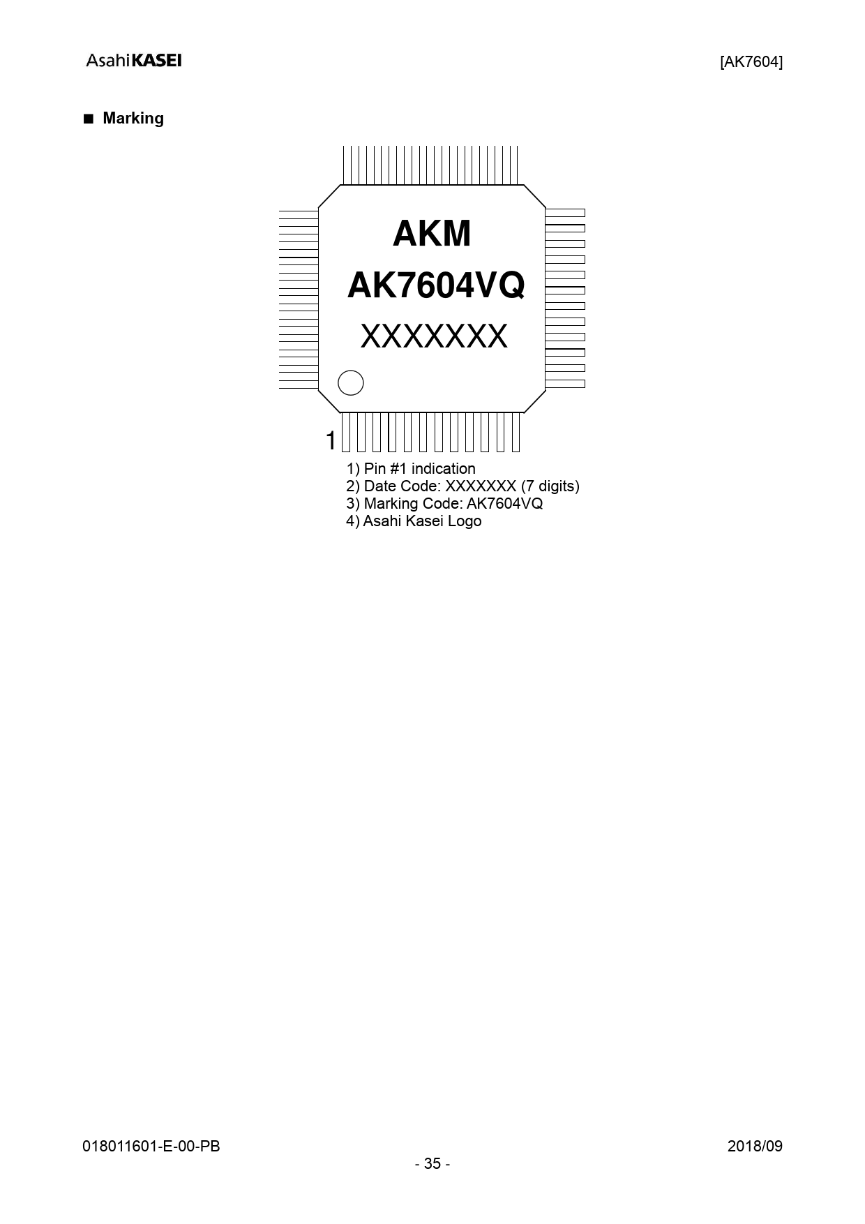 | 页数 / 页 | 37 / 35 — [AK7604] ■ Marking AKM. AK7604VQ. XXXXXXX. 1) Pin #1 indication. 2) Date … |