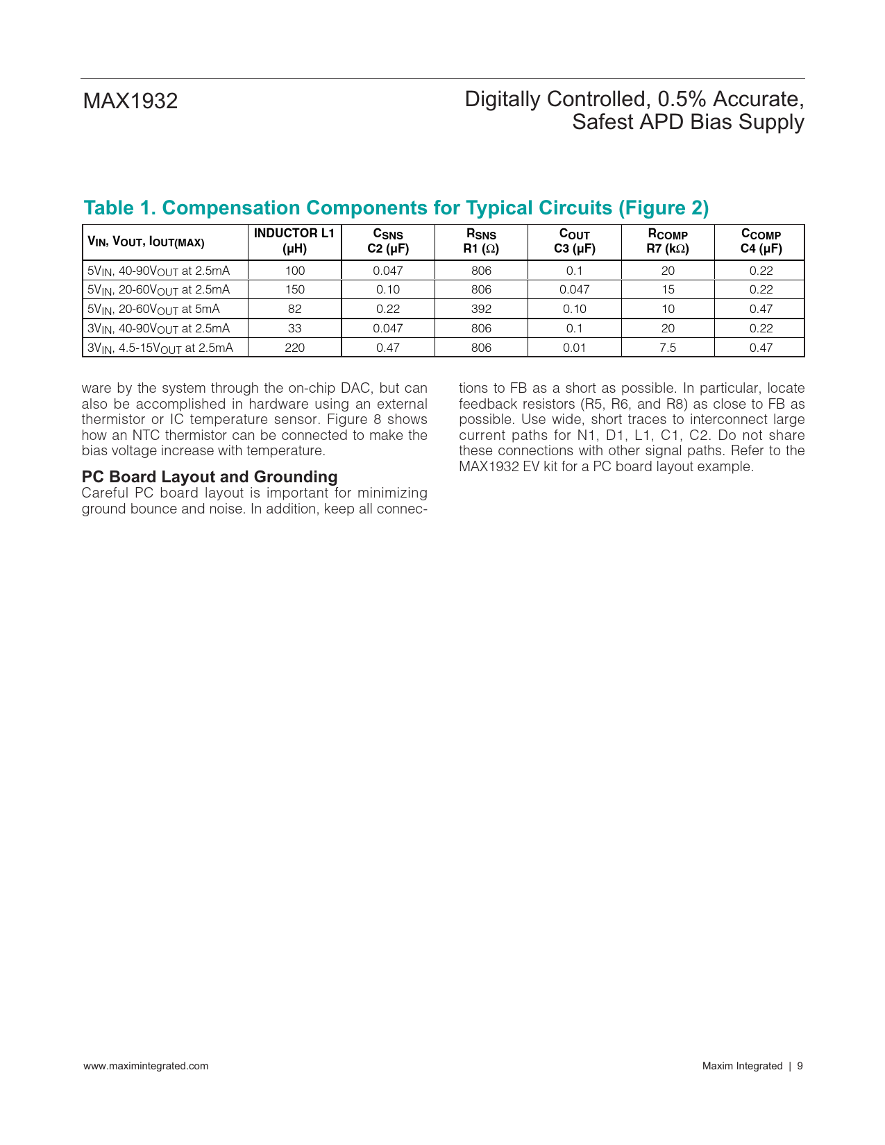 5VIN, 40-90VOUT at 2.5mA 100 0.047 806 0.1 20 0.22 5VIN, 20-60VOUT at 2.5mA 150 0.10 806 0.047 15 0.22 5VIN, 20-60VOUT at 5mA 82 0.22 392 0.10 10 0.47 3VIN, 40-90VOUT at 2.5mA 33 0.047 806 0.1 20 0.22 3VIN, 4.5-15VOUT at 2.5mA 220 0.47 806 0.01 7.5 0.47 ware by the system through the on-chip DAC, but can tions to FB as a short as possible. In particular, locate also be accomplished in hardware using an external feedback resistors (R5, R6, and R8) as close to FB as thermistor or IC temperature sensor. Figure 8 shows possible. Use wide, short traces to interconnect large how an NTC thermistor can be connected to make the current paths for N1, D1, L1, C1, C2. Do not share bias voltage increase with temperature. these connections with other signal paths. Refer to the MAX1932 EV kit for a PC board layout example.